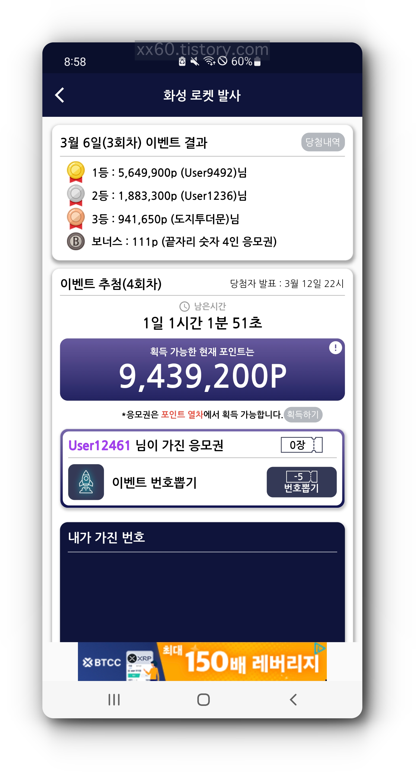 이건 화성 로켓 발사인데요. 화성 로켓 발사에서는 이벤트 추첨이라는 것이 진행되어 1등, 2등, 3등은 각각 전체 금액의 60%, 20%, 10%를 받을 수 있습니다. 이벤트 추첨에 참여하기 위해선 응모권이라는 것이 필요한데, 응모권은 포인트 열차에서 게임에 참여하고 얻을 수 있고요. 응모권으로 [이벤트 번호 뽑기]를 할 때마다 화면에 보이는 전체 금액이 쌓이게 됩니다.