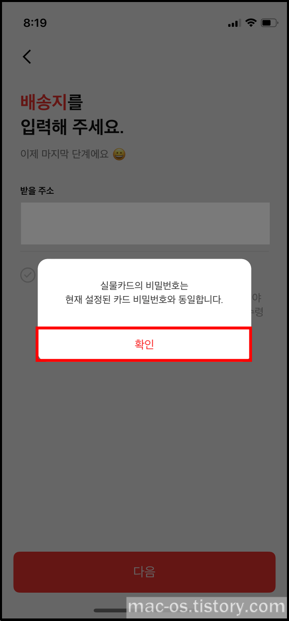 실물카드를 받을 주소를 입력합니다.