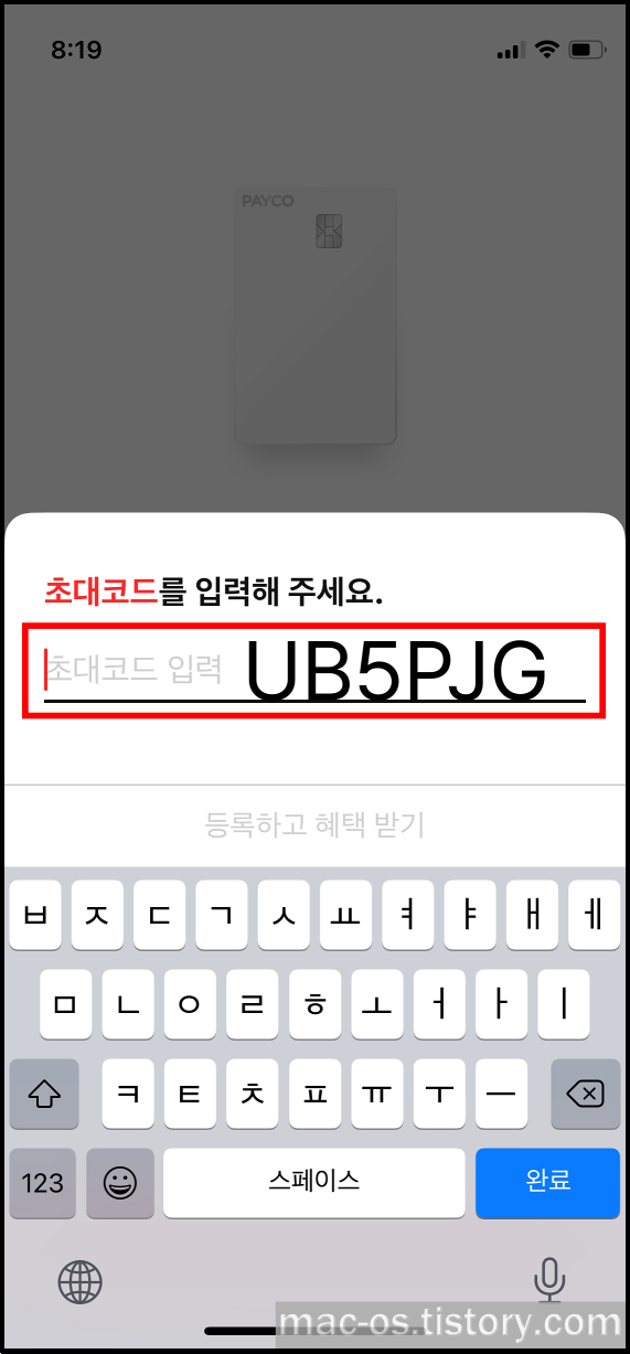 실물카드 발급 신청 완료 페이지에서 초대코드를 입력할 수 있습니다. 초대코드 입력란에 UB5PJG를 입력하면 페이코에서 현금처럼 사용이 가능한 적립 포인트 5,000P를 받을 수 있습니다.