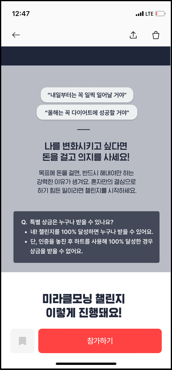 위 챌린지는 현재 이벤트로 진행되고 있는 '미라클모닝 챌린지'입니다. 평일 아침 매일마다 진행되는 챌린지로, 챌린지 기간은 7월 11일부터 7월 22일입니다. 자신의 돈을 걸고 100% 인증에 성공하면 참가비 전액과 성공 리워드를 받을 수 있습니다. 참가율 85%만 성공해도 참가비 전액이 환급됩니다.
