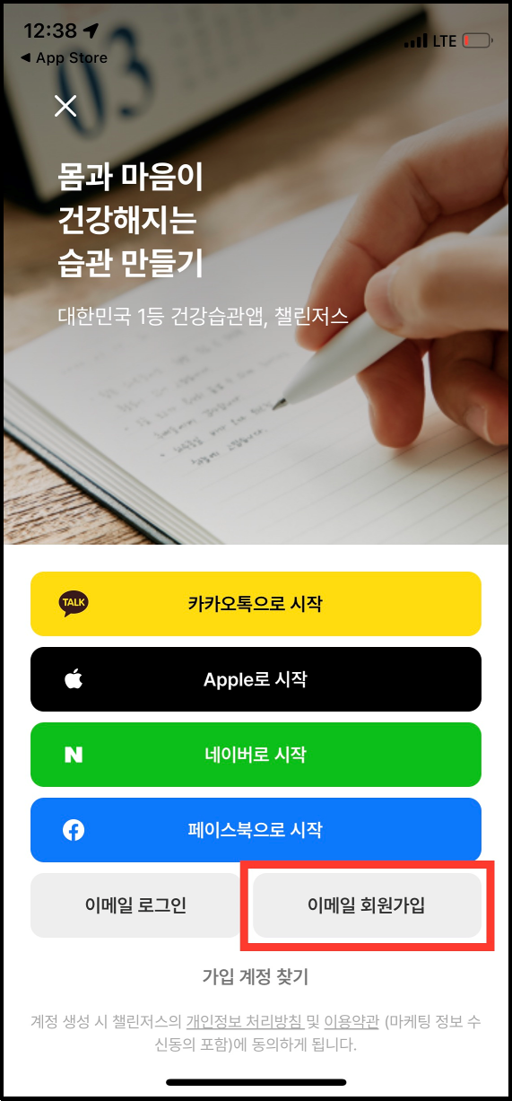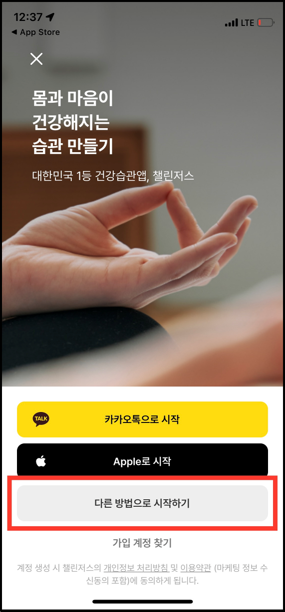 [다른 방법으로 시작하기]를 터치하면 이메일로 회원가입을 진행할 수 있습니다. 카카오톡이나 애플, 네이버, 페이스북 계정으로 시작하셔도 괜찮습니다.