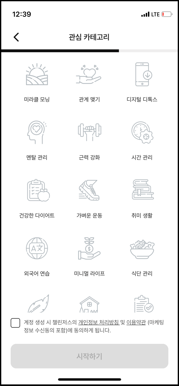 관심있는 카테고리를 선택하고 개인정보 처리방침과 이용약관에 동의하면 챌린저스 회원가입이 완료됩니다.