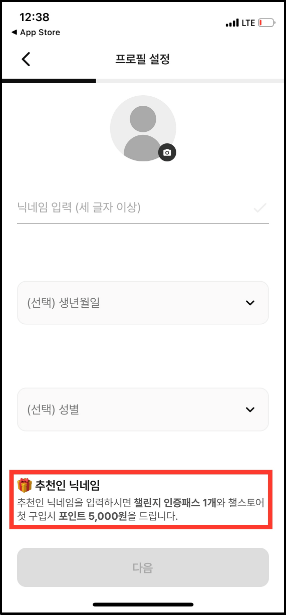 프로필 설정 페이지에서 닉네임과 생년월일, 성별, 추천인 닉네임을 입력할 수 있습니다. 추천인 닉네임을 입력하시면 챌린지 인증패스 1개와 챌스토어 첫 구입시 포인트 5천원을 받을 수 있습니다. 입력할 추천인이 없으신 분들은 ao887을 입력해주세요.