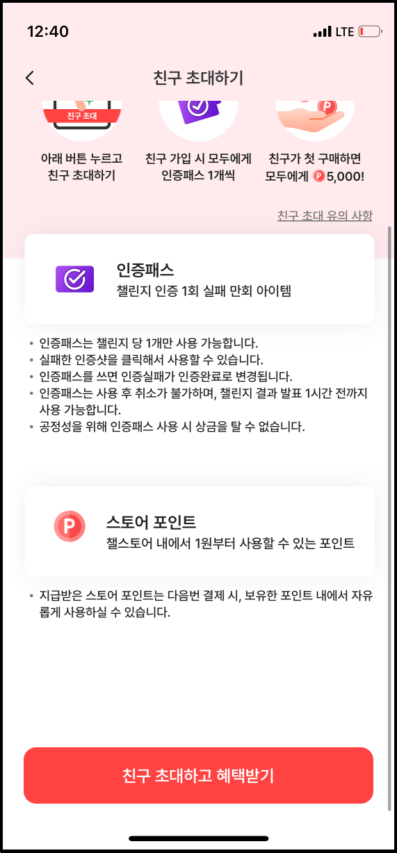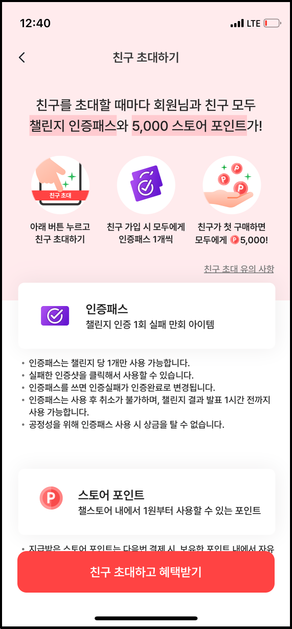 챌린저스에서 진행하는 친구초대 이벤트입니다. 친구를 1명 초대하면 친구와 나 모두에게 챌린지 인증패스 1개를 지급하고, 초대받은 친구가 챌스토어에서 상품을 처음으로 구매하면 친구와 나 모두 스토어 포인트 5천원을 받게 됩니다.