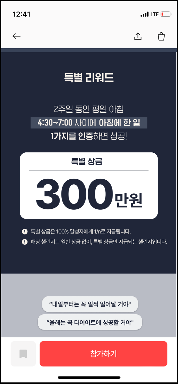 2주일 동안 평일 아침 4시 30분부터 7시 사이에 아침한 일 1가지를 사진으로 촬영하여 인증하면 성공입니다. 특별 상금은 300만원으로, 100% 달성자에게 n분의 1로 지급됩니다.