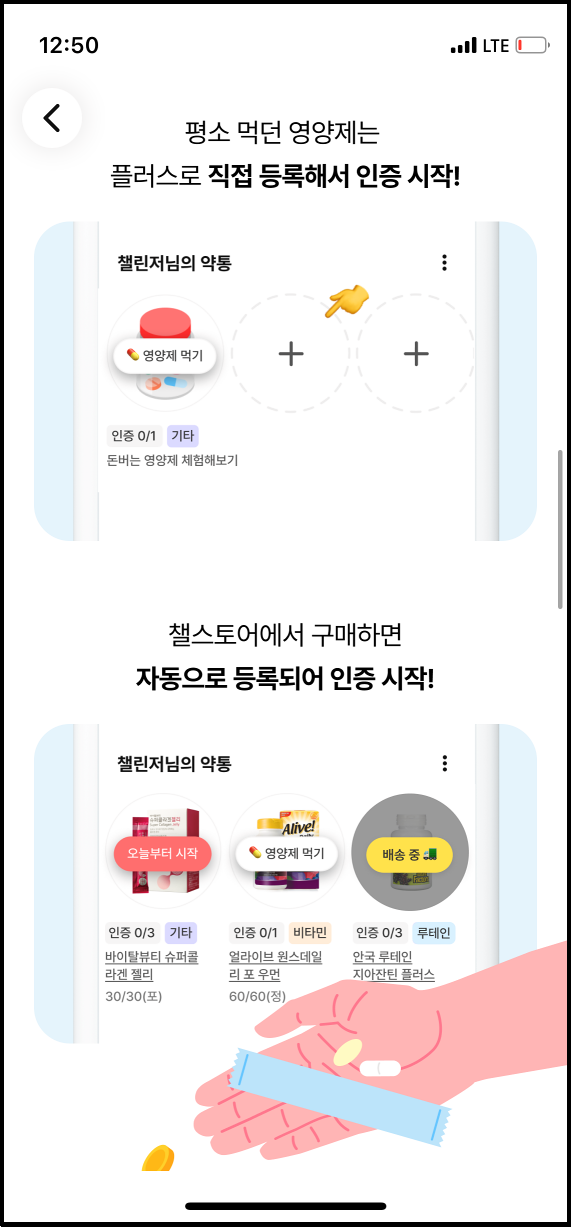 평소 먹던 영양제는 플러스로 직접 등록해서 인증을 시작하면 되고, 챌스토어에서 영양제를 구매하면 자동으로 등록되어 인증이 시작됩니다.
