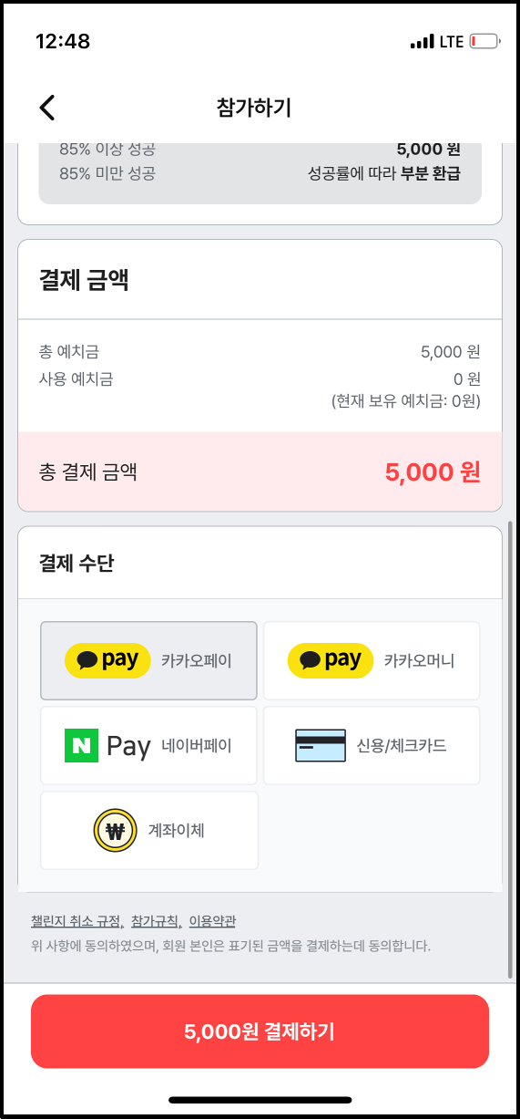 다른 챌린지에선 예치금을 본인이 설정할 수 있지만 미라클 모닝 챌린지는 5천원만 걸 수 있습니다. 100% 인증에 성공하면 6,152원을 받을 수 있는데요. 예상이긴 하지만 5천원을 걸고 좋은 습관과 1,152원을 더 받는다면 생각보다 괜찮아 보입니다.