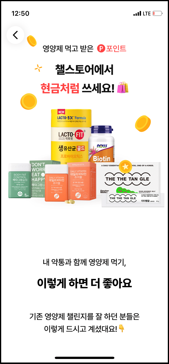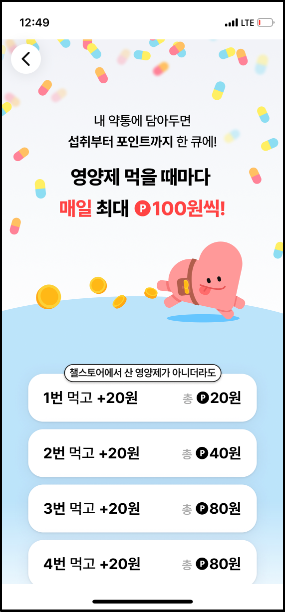 챌스토어에서 산 영양제가 아니더라도 내 약통에 영양제를 담아둘 수 있습니다. 동일한 영양제 1개를 하루에 여러 번 먹는 경우에도 포인트가 지급됩니다.