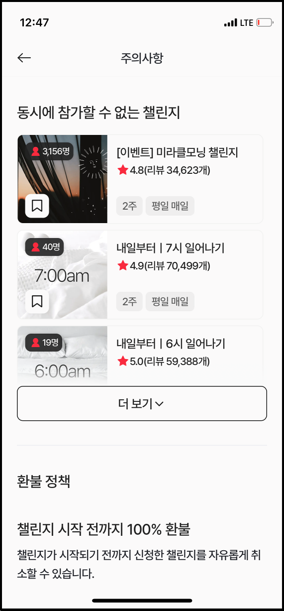 미라클 모닝과 유사한 챌린지는 동시에 참가할 수 없습니다. 챌린지가 시작되기 전까지는 100% 환불이 가능하지만, 챌린지가 시작되고 나선 취소가 불가합니다.