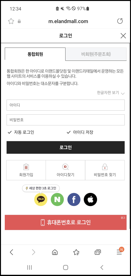 이랜드몰 홈페이지에서 좌측 상단 더보기 메뉴를 누른 뒤, [로그인]을 진행합니다.