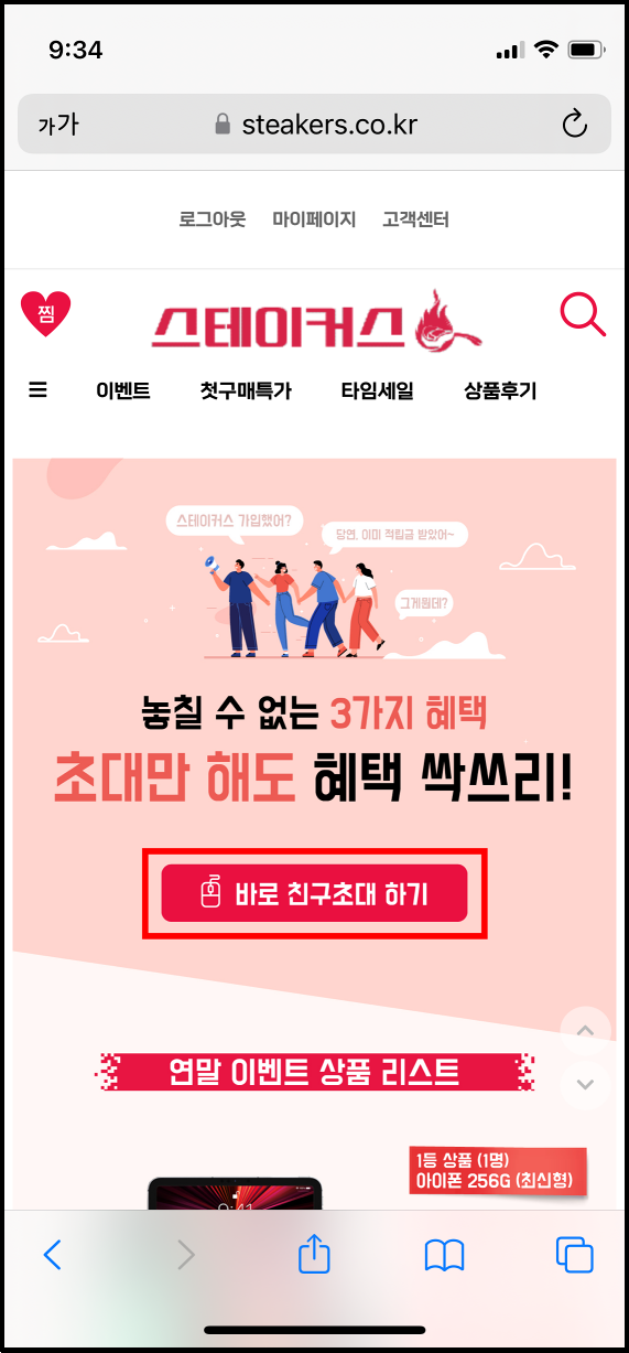 스테이커스 홈페이지 좌측 상단 [이벤트]를 터치하고 [바로 친구초대 하기] 버튼을 누른다.