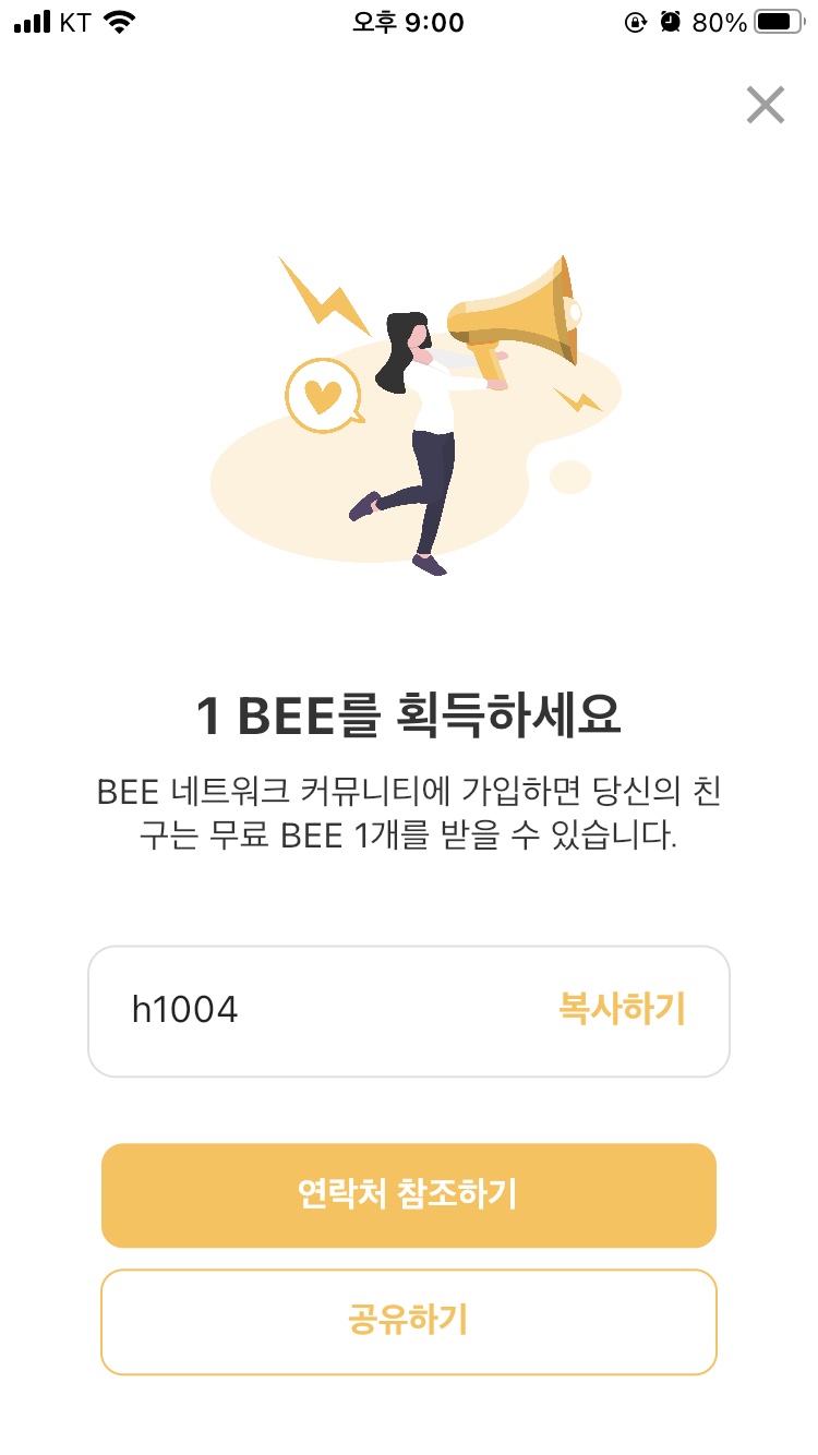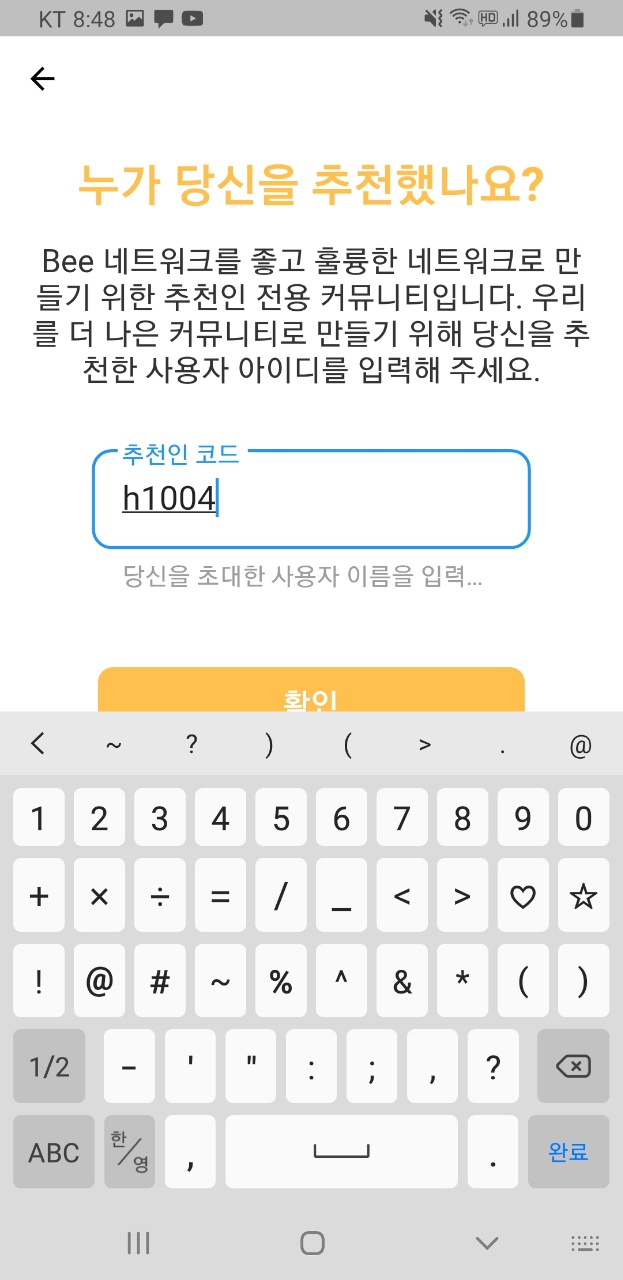 확인을 누르시게 되면, 추천인 코드를 입력하는 페이지가 나타나게 됩니다. 해당 페이지에서 "h1004"를 입력하고 가입하시게 되면 1BEE와 채굴 속도가 향상되는 혜택이 있으니 꼭 입력하고 가입하시기 바랍니다.