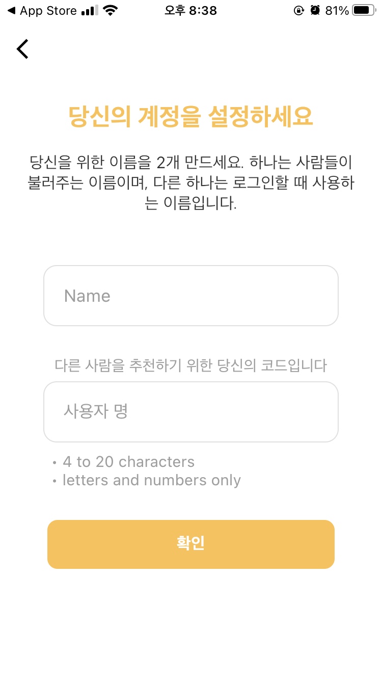 그럼 Name과 사용자 명을 입력하게 됩니다. Name은 닉네임, 별명과 같은 느낌이고 사용자 명은 다른 사람들을 초대할 때 사용되는 추천인 코드와 동일하다고 보시면 되겠습니다.