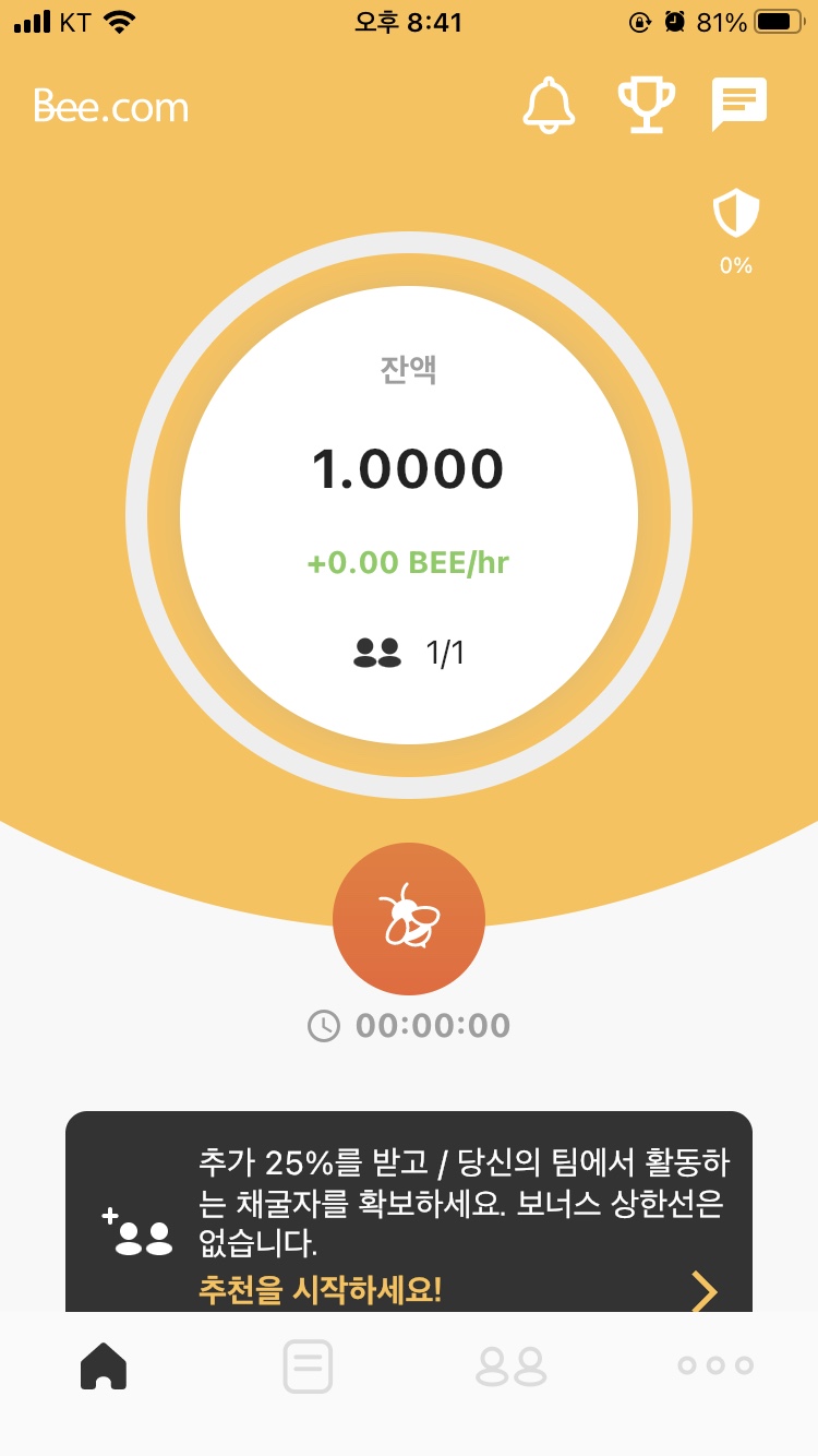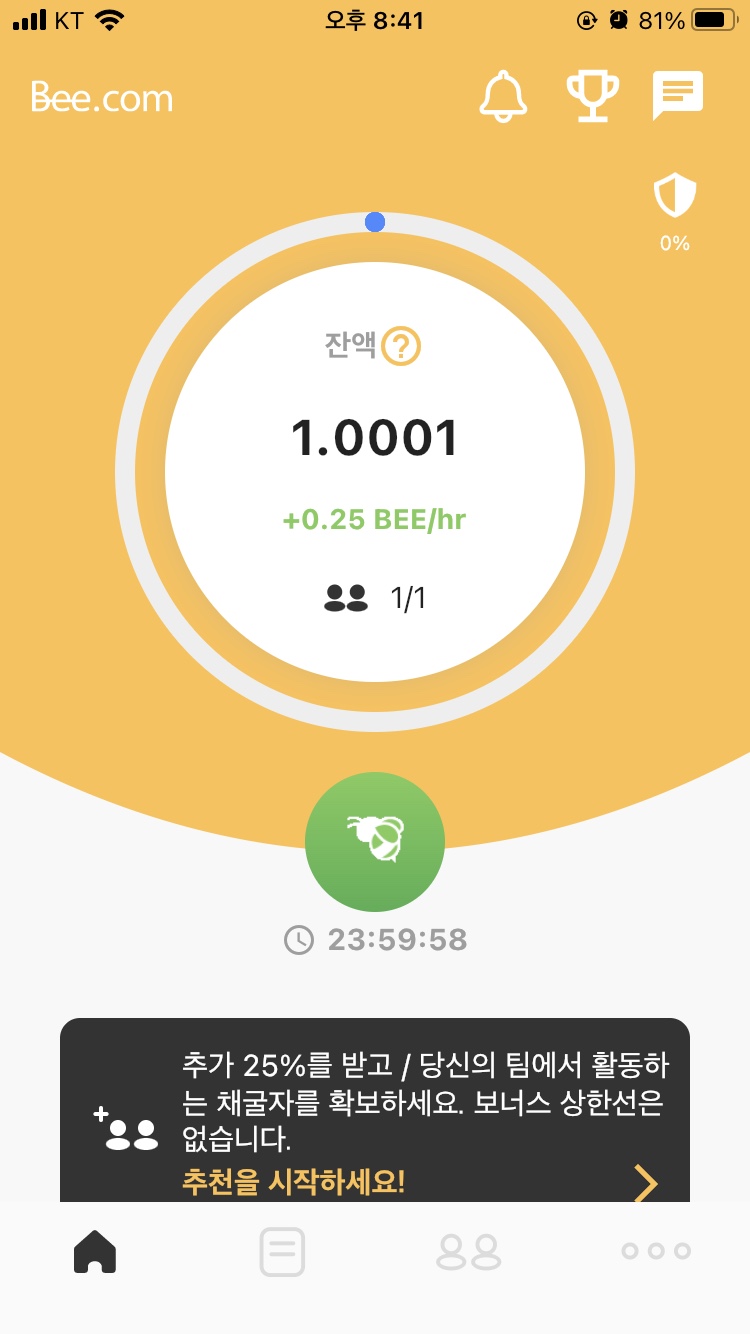 회원가입이 완료되었습니다. 이제 화면 중앙에 있는 빨간색 모양의 동그라미 벌꿀 모양 버튼을 누르면 채굴이 시작됩니다. 채굴은 파이코인과 동일하게 24시간동안 진행되며, 마찬가지로 앱이 백그라운드 내에 실행되지 않습니다.