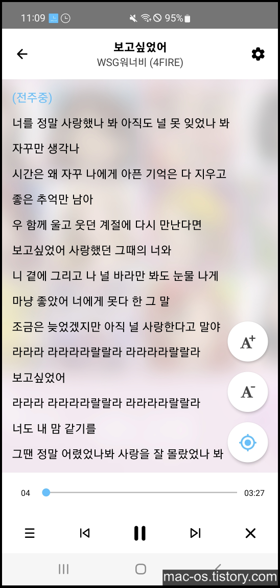 [음악 듣기]는 유튜브에서 적절한 영상을 찾아서 재생해주는 기능으로, 유튜브에서 영상이 삭제되는 경우 음악이 재생되지 않을 수 있다. 하지만 가사도 나오고 무료로 음악을 들을 수 있다는 점이 좋은 것 같다.