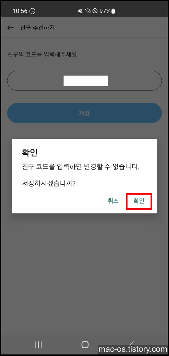 친구 코드를 입력하면 변경할 수 없다고 뜨는데, 여기서 [확인]을 눌러주면 추천인 입력이 완료된다.