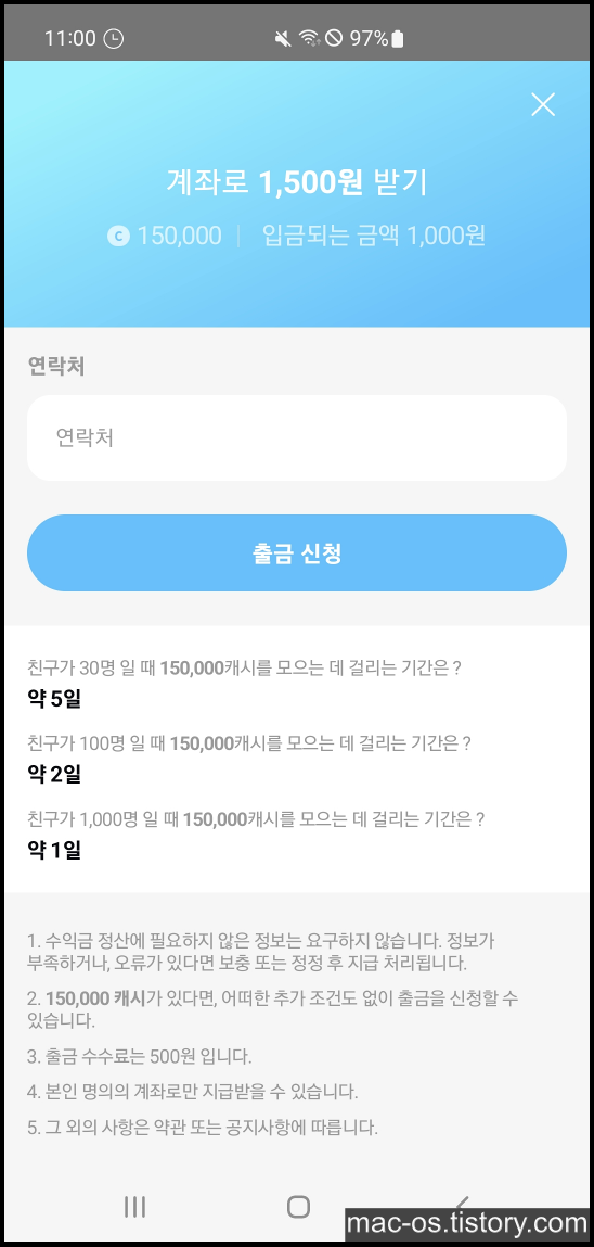 3만 캐시는 현금 300원인데, 많이 짠 편인 것 같다.. 그리고 내용에 자신의 추천인을 홍보할 수 없게 되어 있어서 좀 별로인 것 같다.