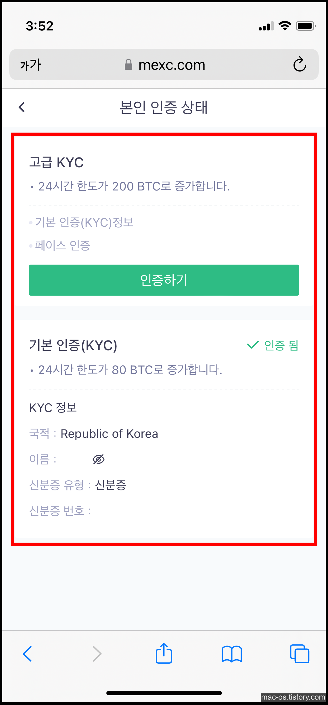 [신분증] 페이지에서 기본/고급 KYC 인증을 진행할 수 있습니다. 기본과 고급 중 마음에 드는 걸로 하시면 됩니다.