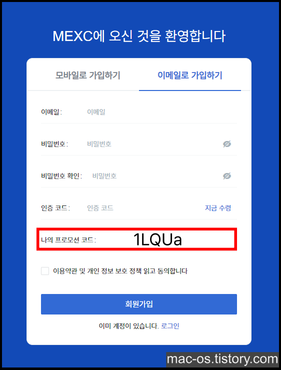 회원가입 페이지에서 [나의 프로모션 코드]에 1LQUa를 복사해서 입력하고 [회원가입]을 클릭합니다.
