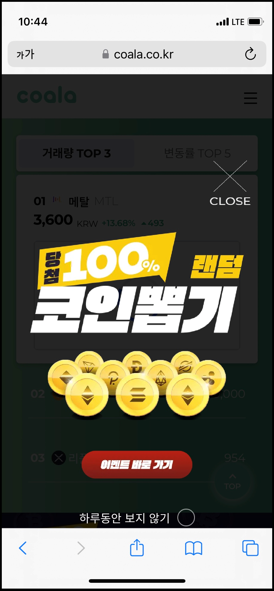 가입을 마치고 [메인페이지]를 누르면 아까 이벤트 배너가 뜨는데요. 이걸 눌러주세요. 배너가 뜨지 않는다면 [이벤트] 탭의 코인뽑기 페이지로 이동하거나, 위에 제가 올렸던 이벤트 사이트로 다시 접속하시면 됩니다.