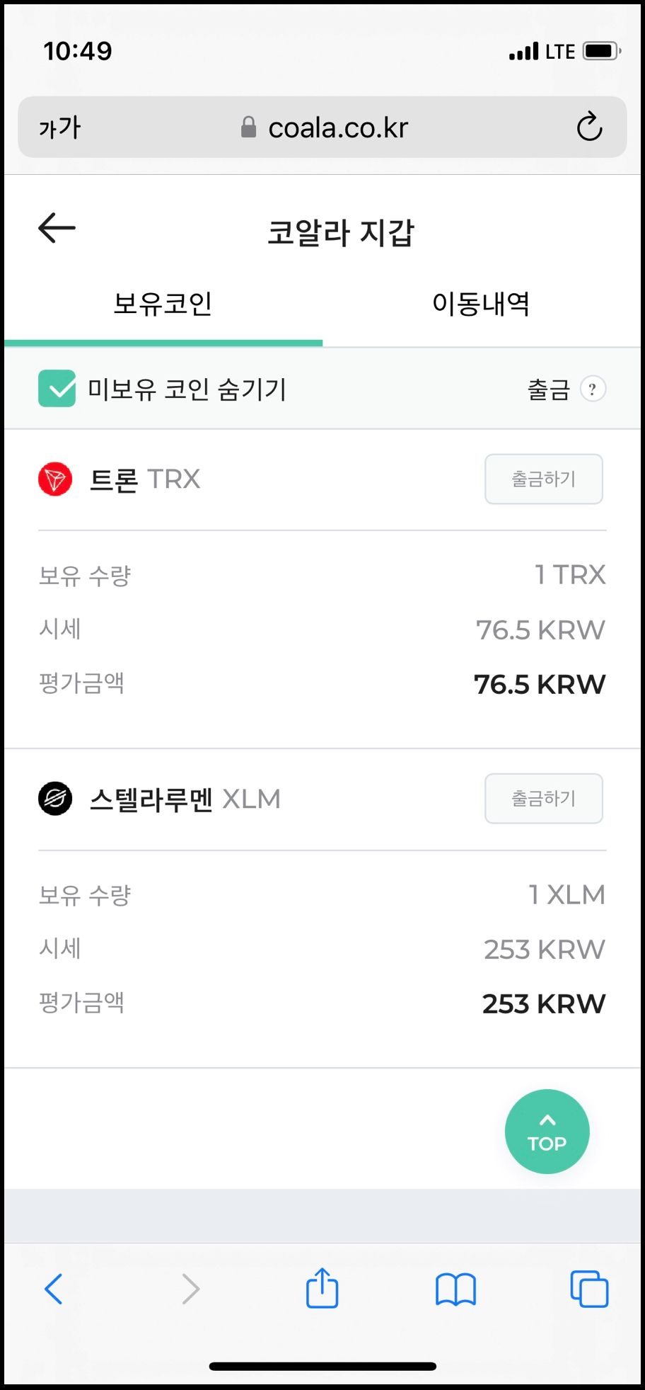 [포인트 관리] > [코알라 지갑]으로 이동하면 코인뽑기에서 얻었던 코인을 다른 지갑으로 출금할 수 있습니다. 다만 거래소별 정책으로 인하여 평가금액이 한화기준 5천원 이상일 때만 출금이 가능하다고 하네요.