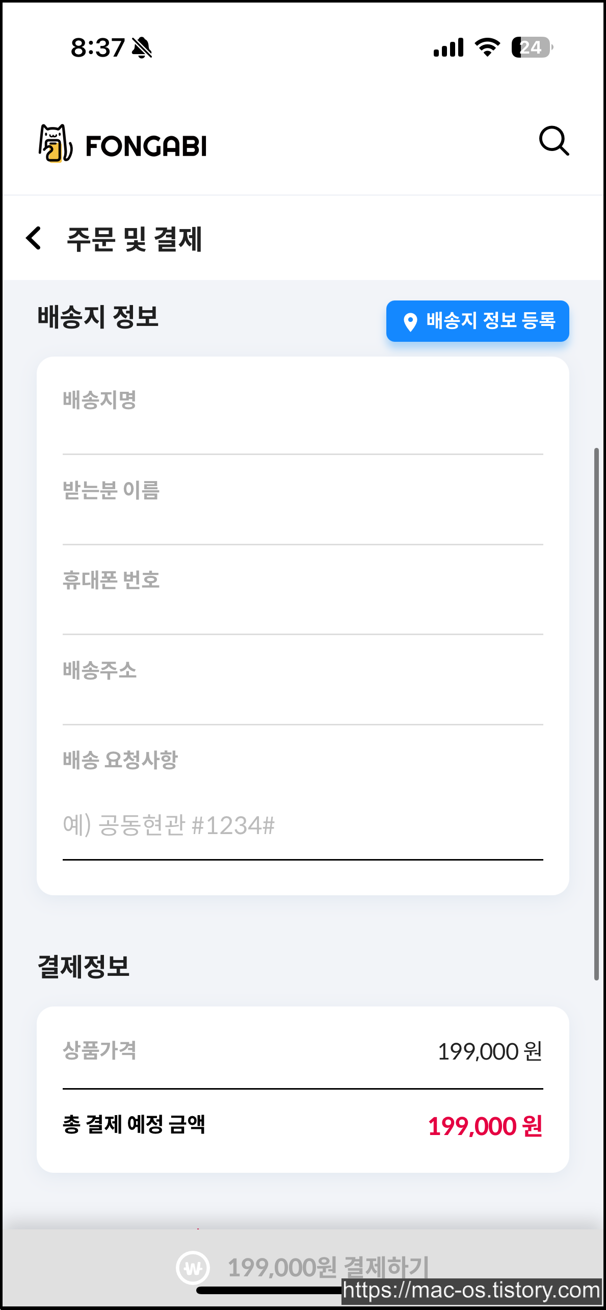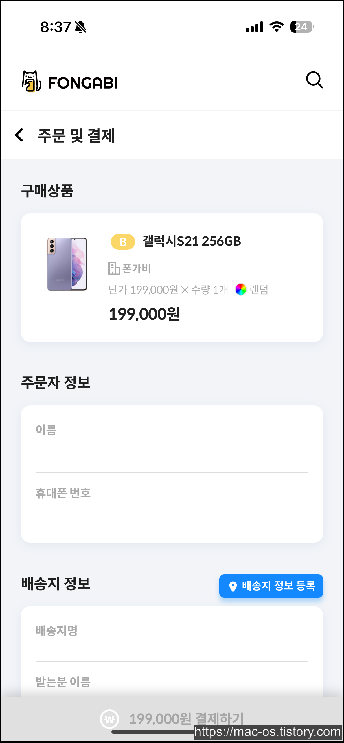결제 페이지에서 주문자 정보, 배송지 정보를 입력한다.