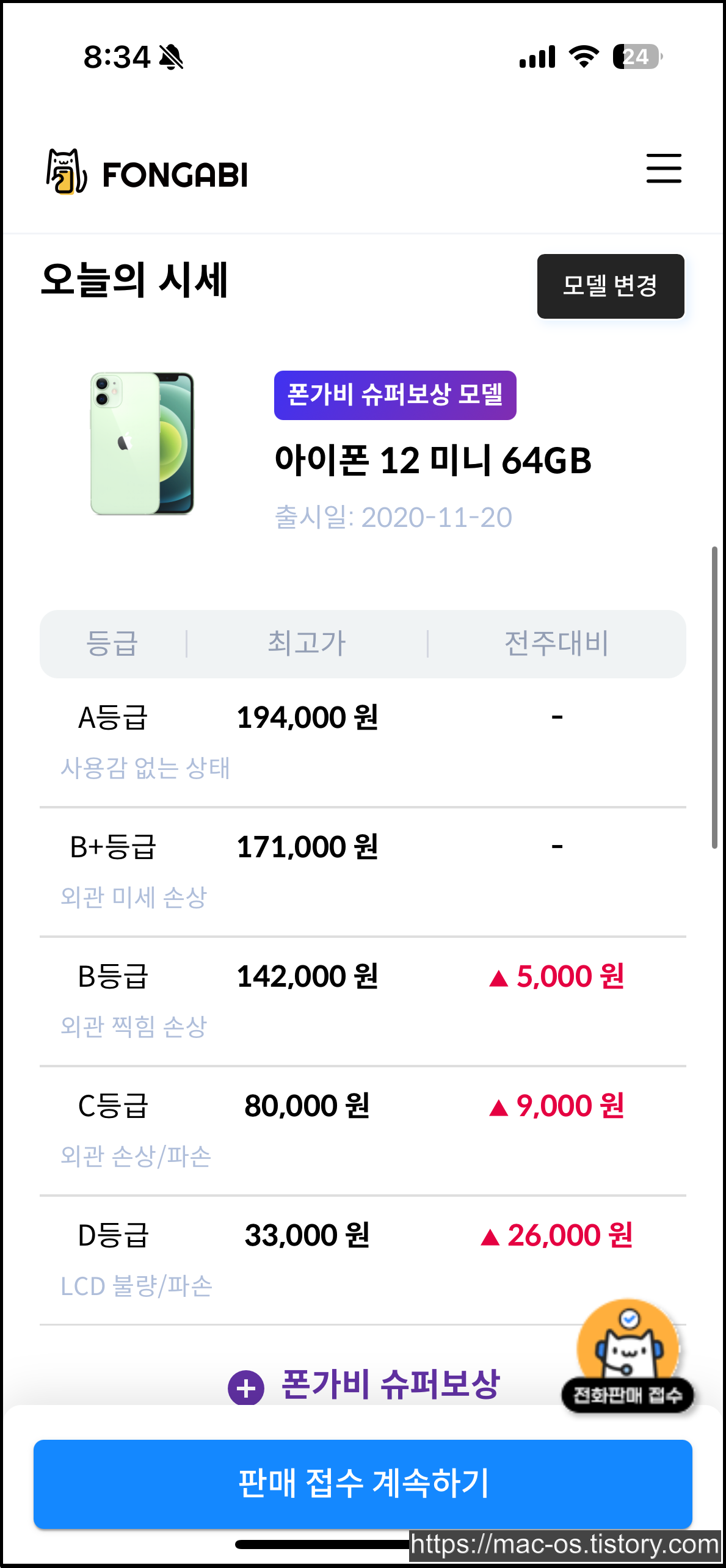 홈 화면에서 판매하기 버튼을 누르고 판매 페이지로 이동하면 본인의 기기 등급에 따라 판매 가격이 얼마인지 확인할 수 있다.