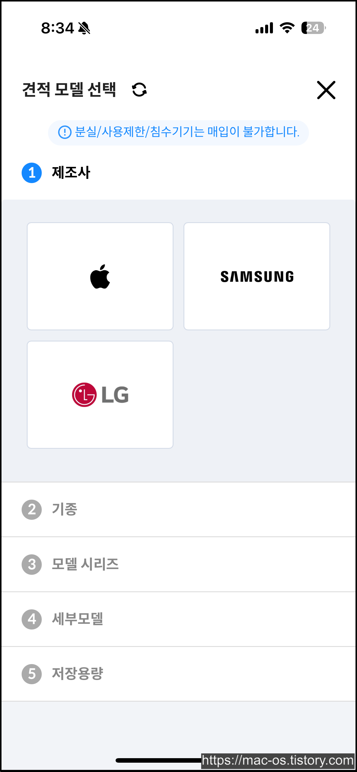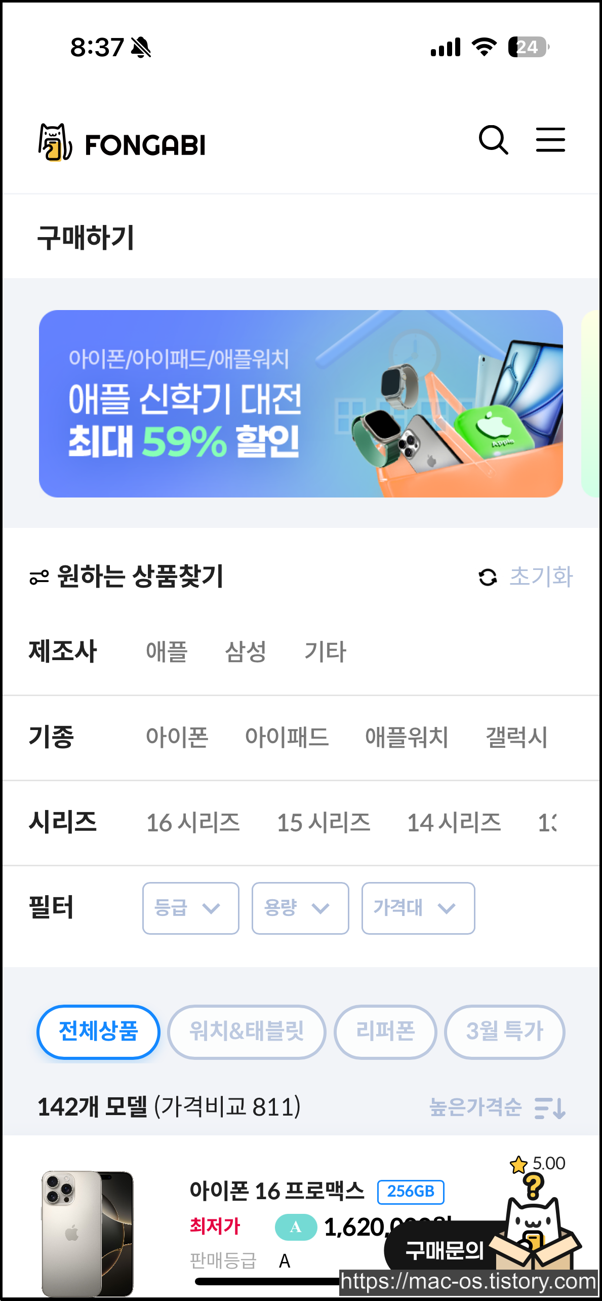 구매하는 방법은 판매하는 것보다 훨씬 쉽다. 구매하기 페이지로 들어와서 제조사, 기종, 시리즈, 필터를 선택하고 원하는 모델을 고르면 된다.