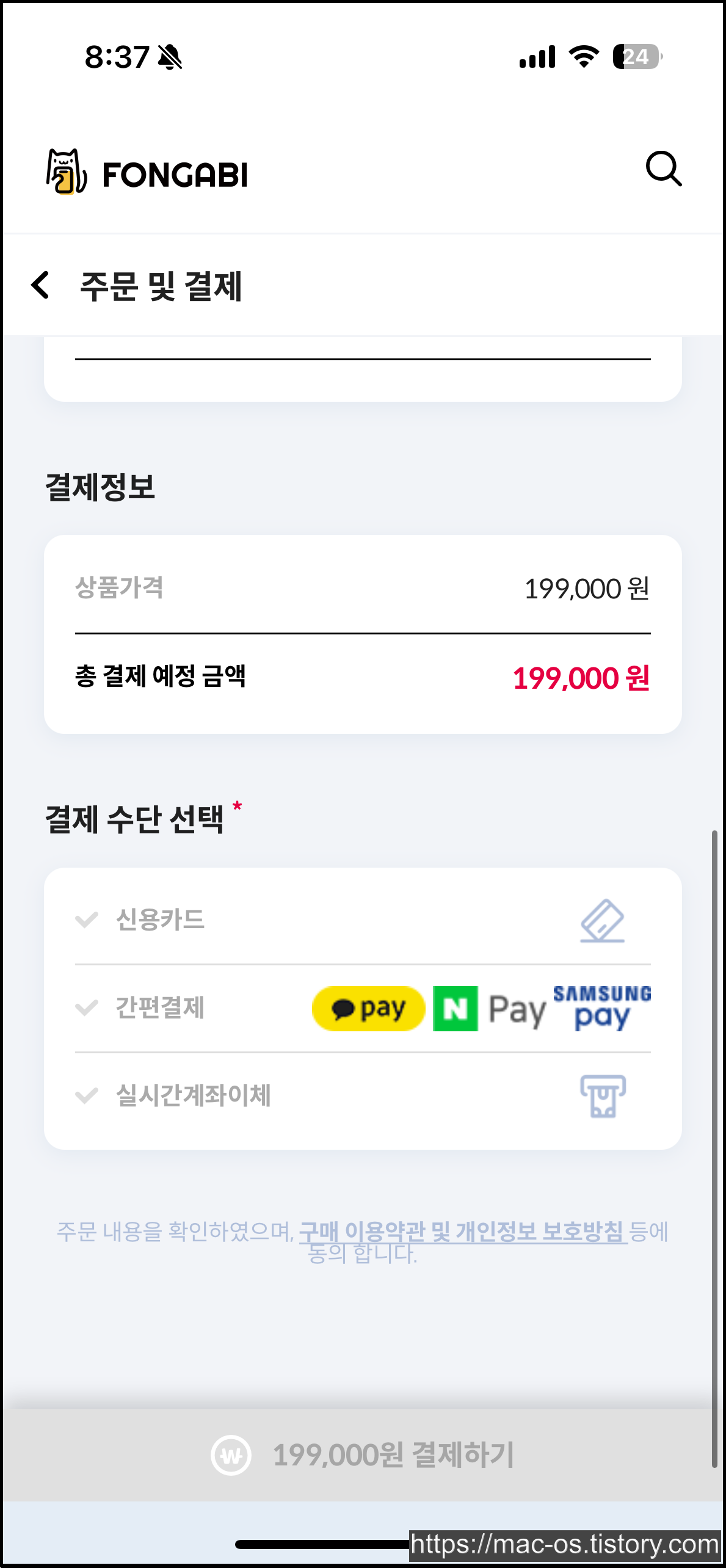 모델을 고르고 바로 구매하기 버튼을 누르면 결제 페이지로 이동하게 된다.