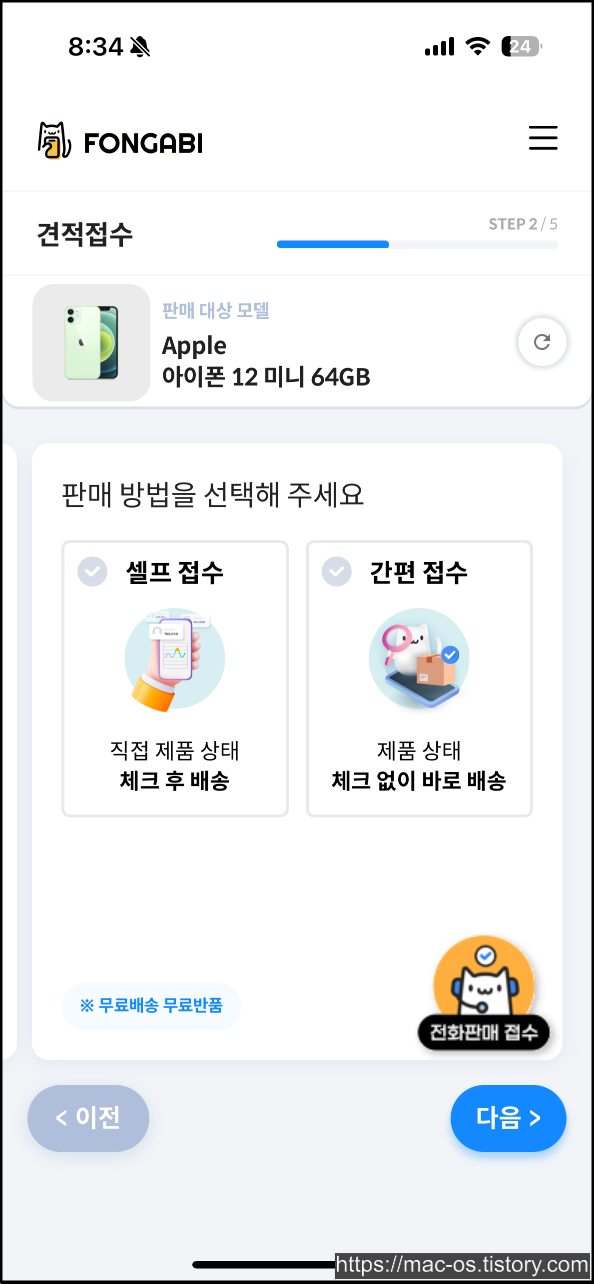 판매 접수 계속하기 버튼을 누르면 제조사, 기종, 모델 시리즈, 세부 모델, 저장용량 등 판매하려는 휴대폰의 정보를 입력하게 된다. 판매 방법은 셀프 접수와 간편 접수로 나뉘는데 셀프 접수는 직접 제품 상태를 체크 후 배송하는 것이고, 간편 접수는 제품 상태 체크 없이 바로 배송하는 것이다.
