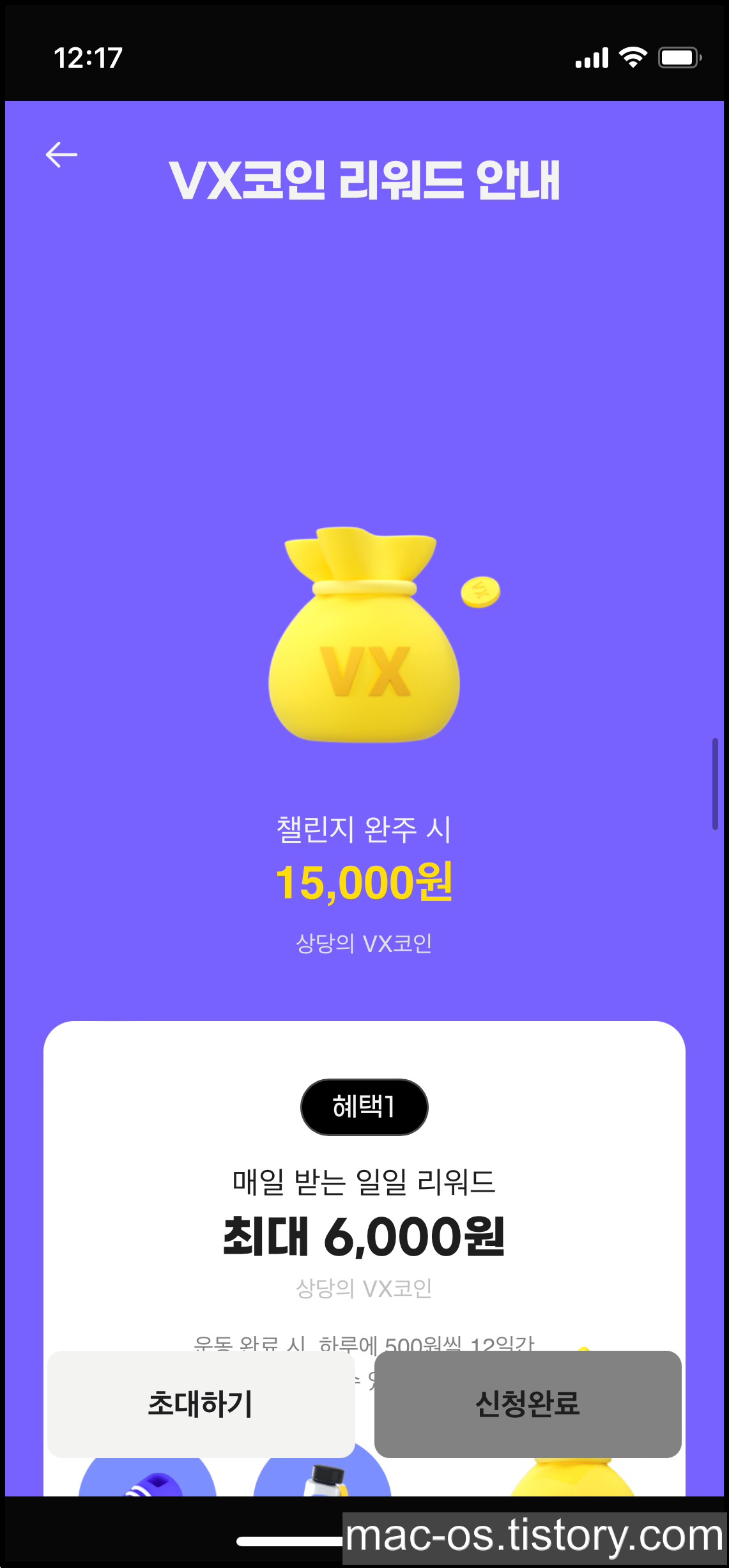 - 혜택 1 : 운동 완료 시 하루에 500원씩 12일간 최대 6,000원 상당의 VX코인을 받을 수 있음.