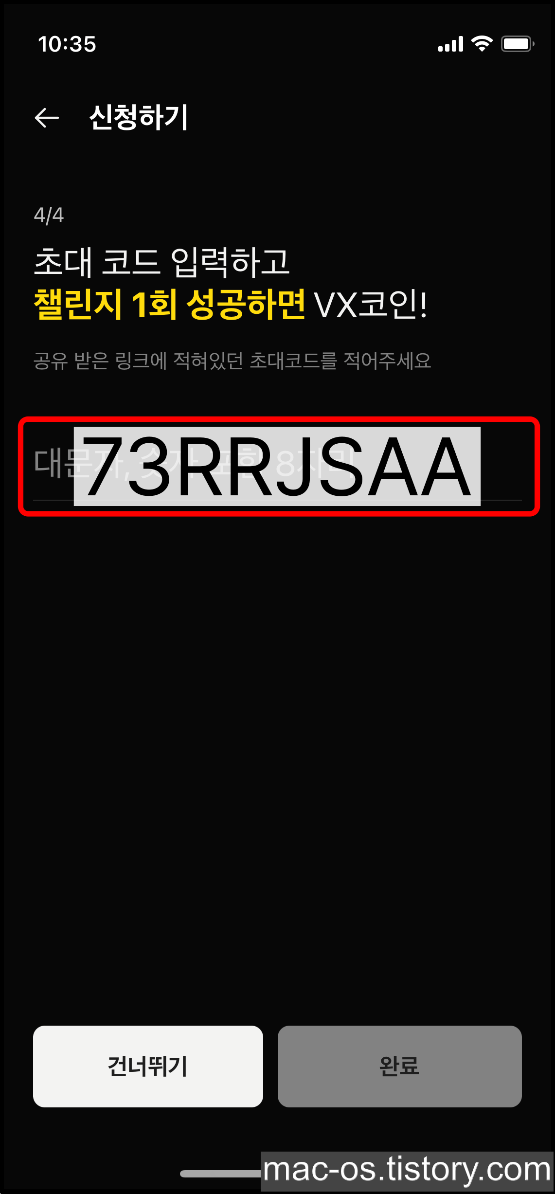 4. 신청 페이지에서 초대코드 73RRJSAA 입력