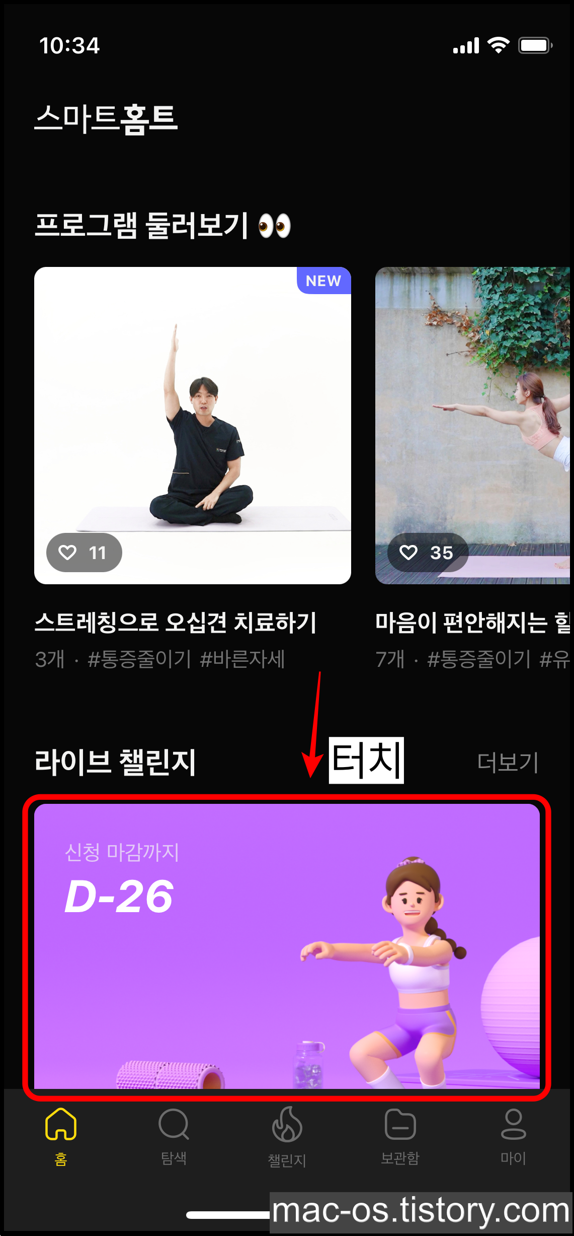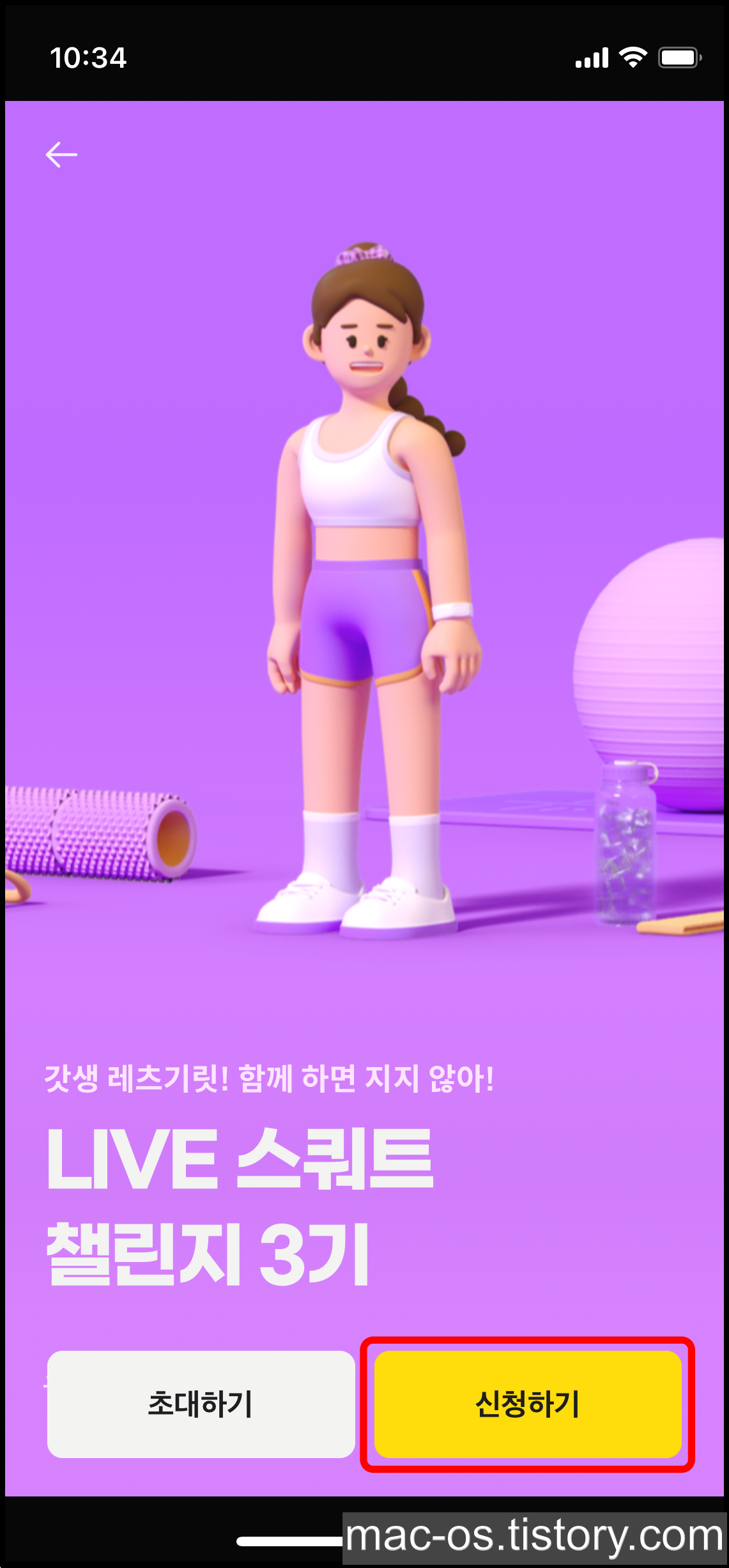 5. 회원가입 후 홈화면에서 라이브 챌린지 [LIVE 스쿼트 챌린지 3기] 배너를 누르고 [신청하기]를 터치해 주세요.