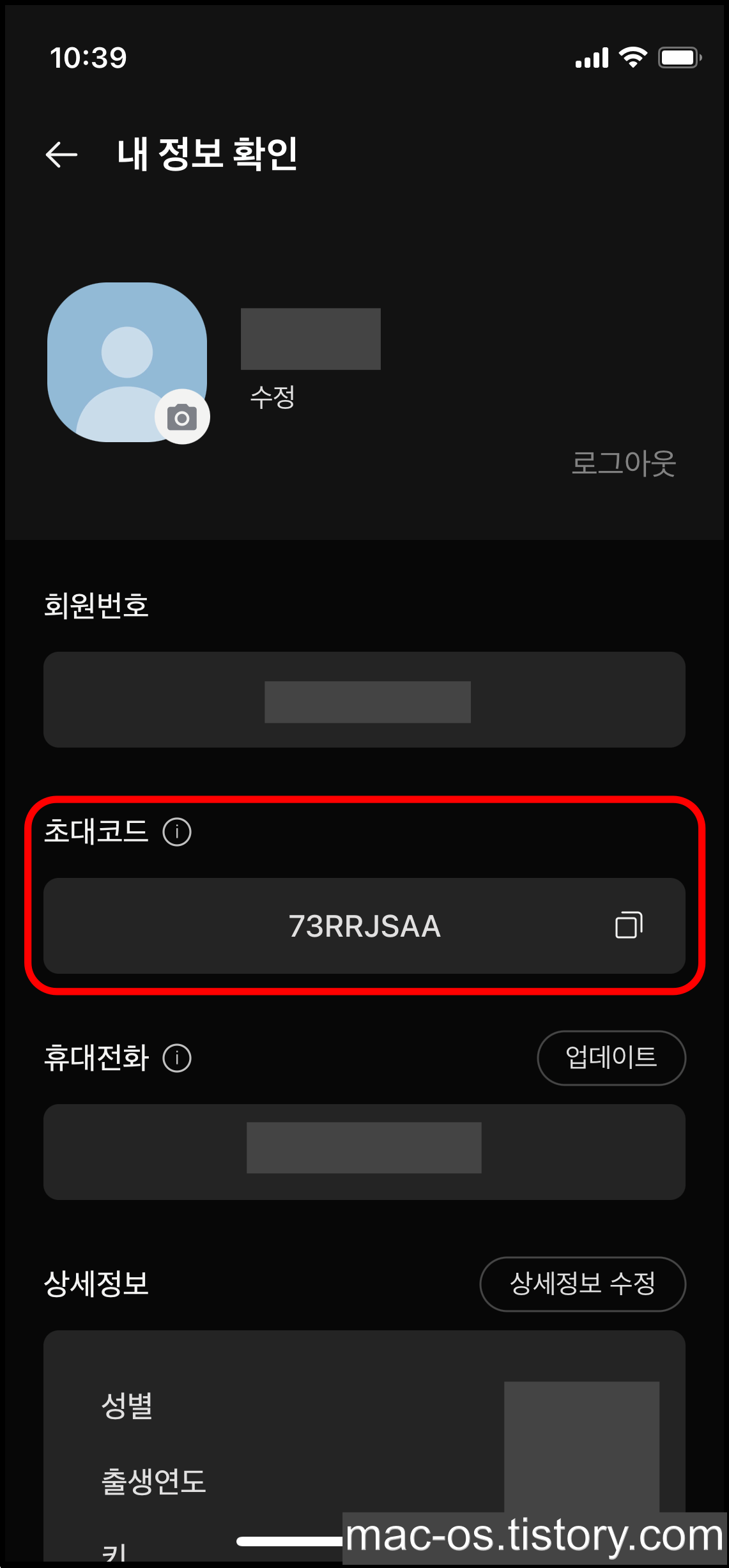 12. [마이]에서 좌측 상단의 이름을 누르시면 [내 정보 확인] 페이지로 이동할 수 있는데요. 여기서 자신의 초대코드를 복사하실 수 있답니다.