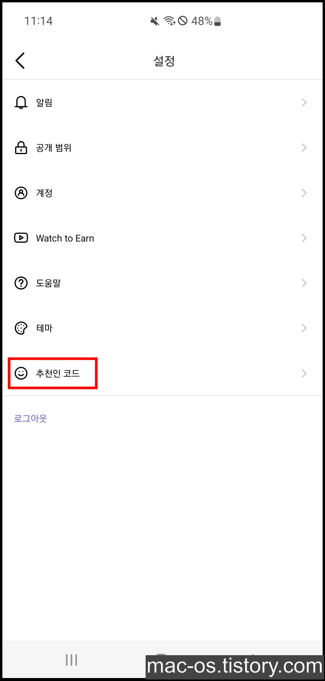 가입하고 나서 오른쪽 위에 더보기 메뉴를 누르고 [추천인 코드]로 이동하면 내 추천인 코드를 확인할 수 있어요.