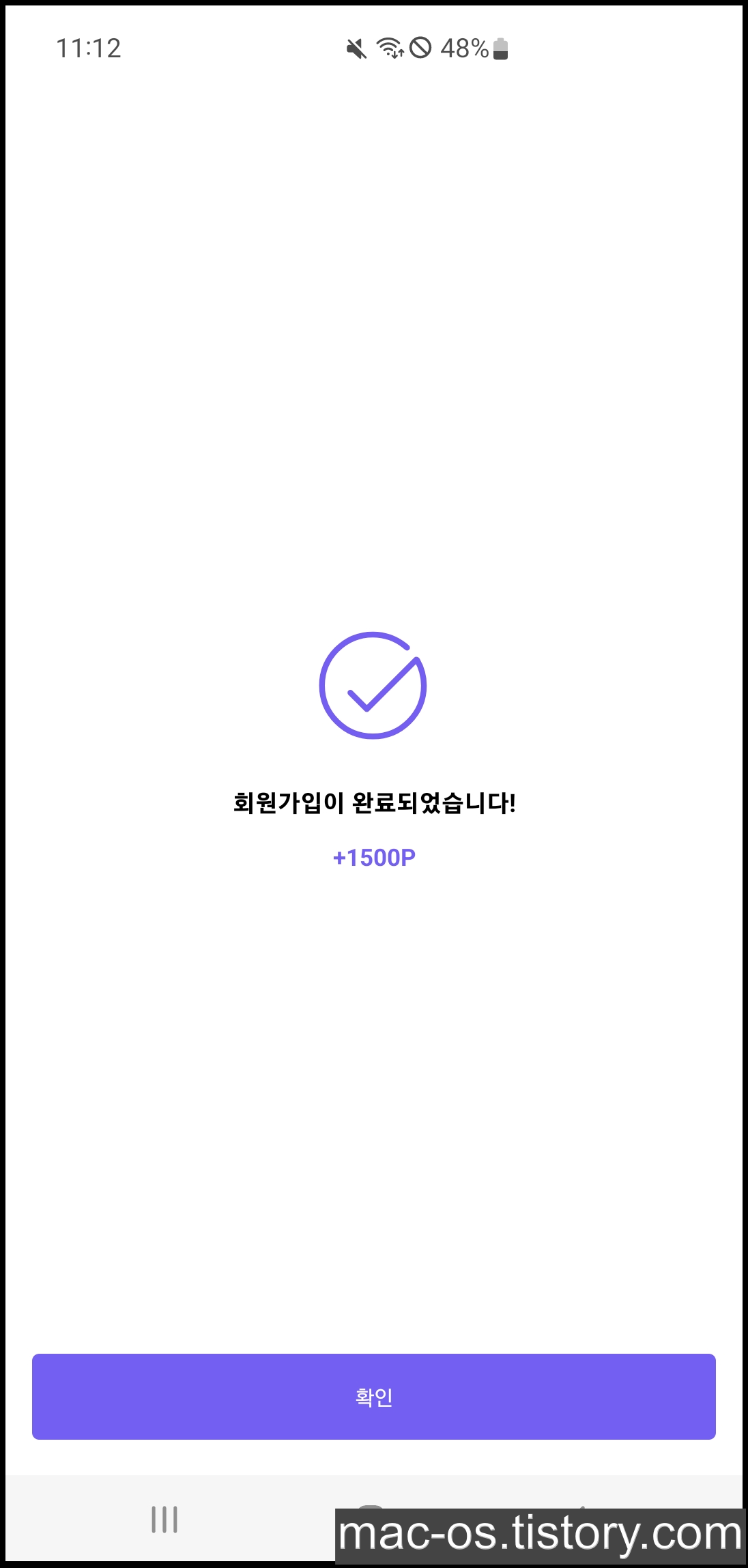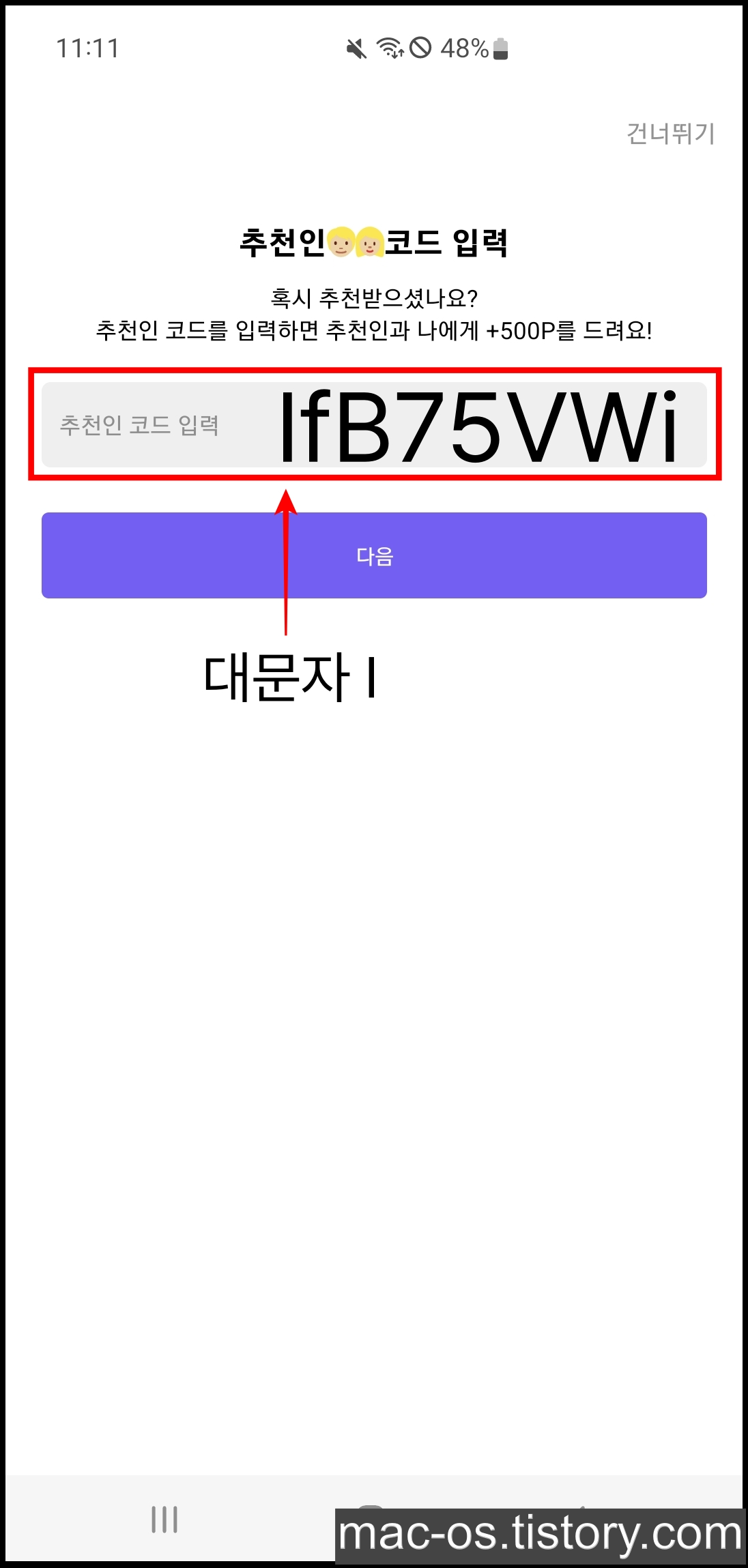 마지막에 추천인 코드 입력할 수 있는데요. IfB75VWi를 복사해서 붙여넣기하시면 500포인트 받으실 수 있어요. 추천인 입력하고나면 회원가입이 끝납니다.