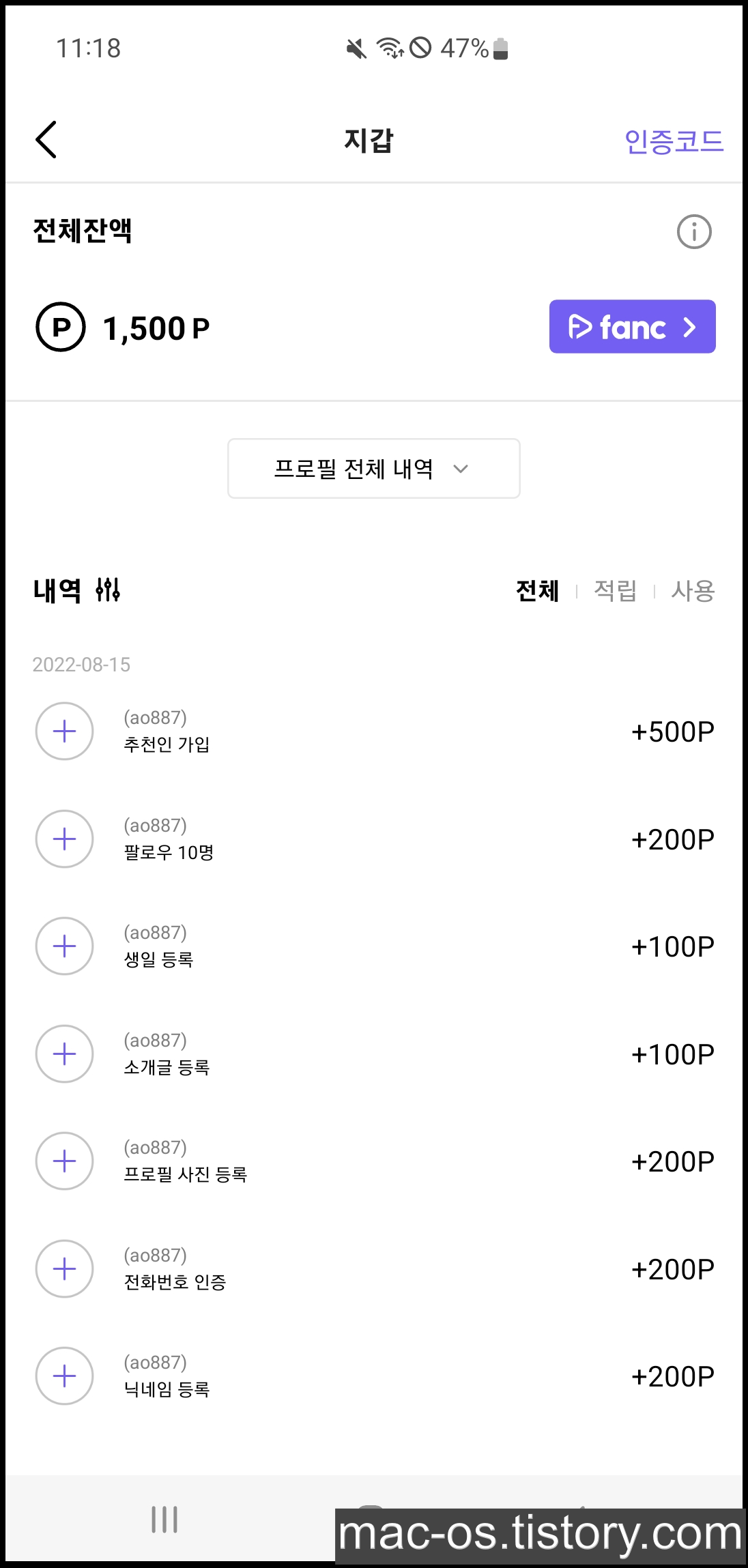 등급 제도같은 것도 있어서 등급이 올라갈수록 하루에 얻을 수 있는 포인트 양이 늘어난다고 하네요. 셀러비에서 얻은 포인트는 Fanc 월렛이라는 앱을 통해서 Fanc 포인트로 교환할 수 있는데,