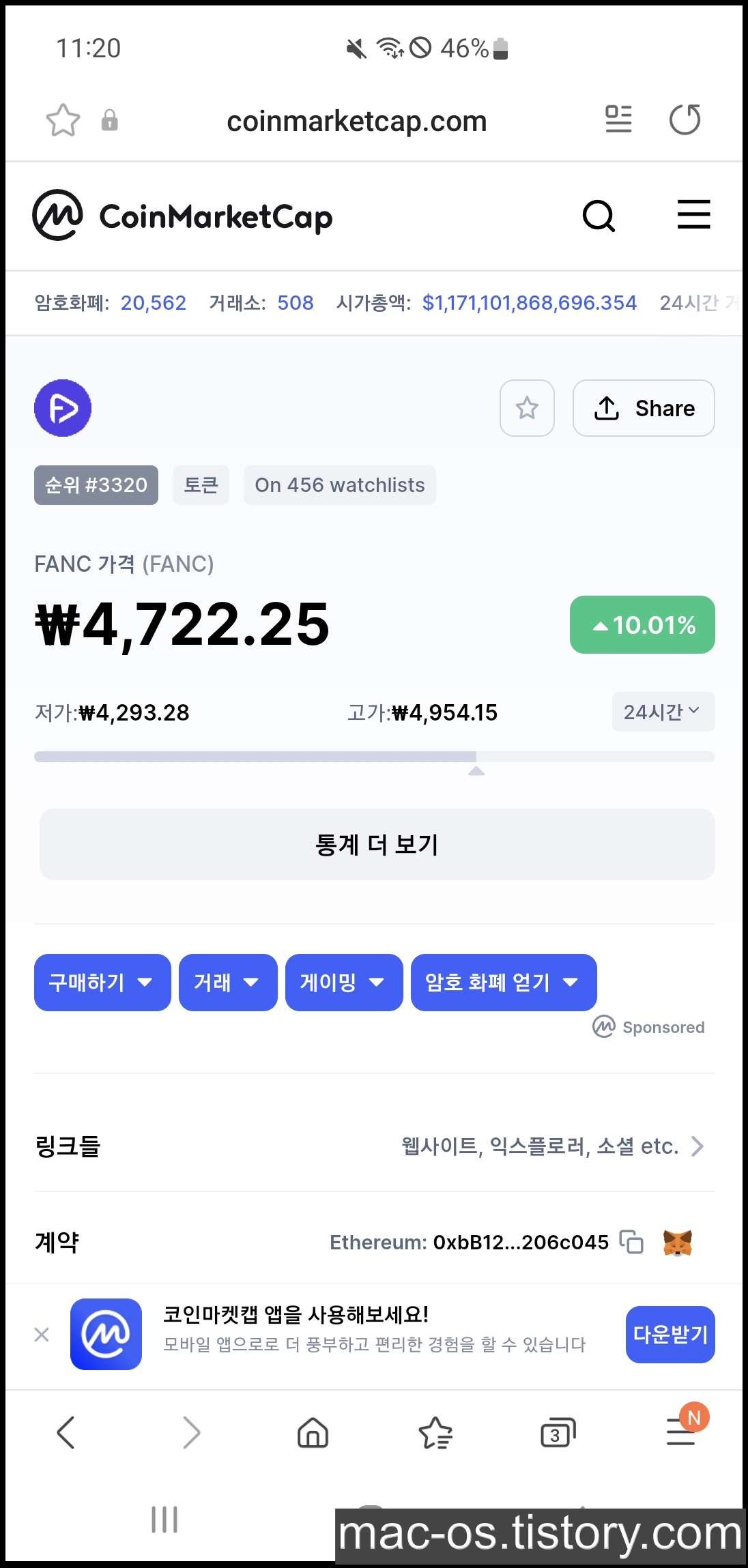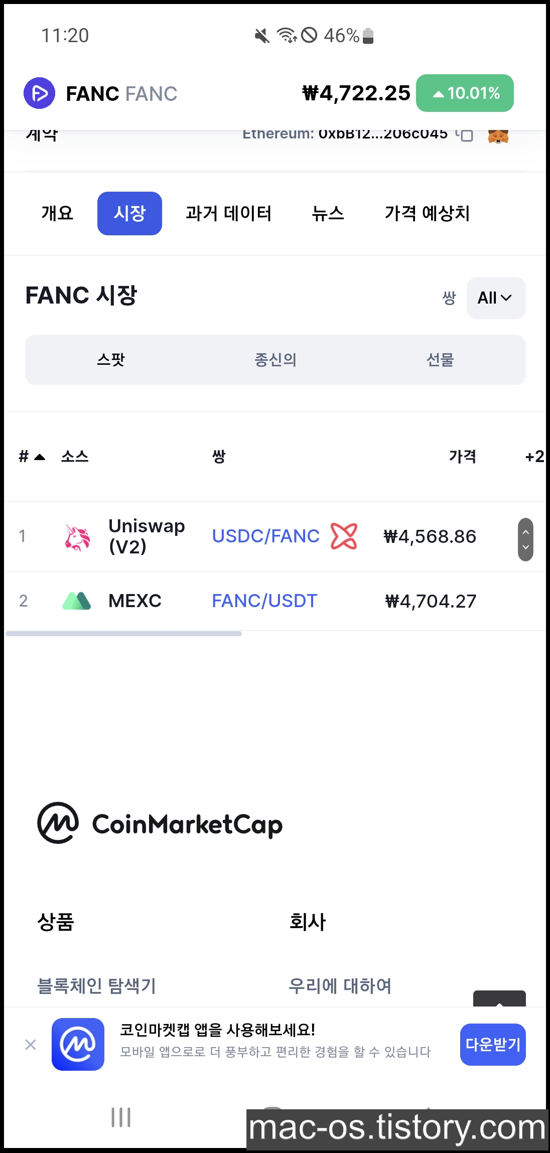 코인마켓캡에서 FANC를 검색해봤는데 토큰 1개당 4700원 정도하네요. 유니스왑이랑 MEXC에 상장되어 있는데, 유니스왑은 잘 모르겠고 MEXC에는 실제로 거래되고 있는걸 확인하실 수 있었어요.