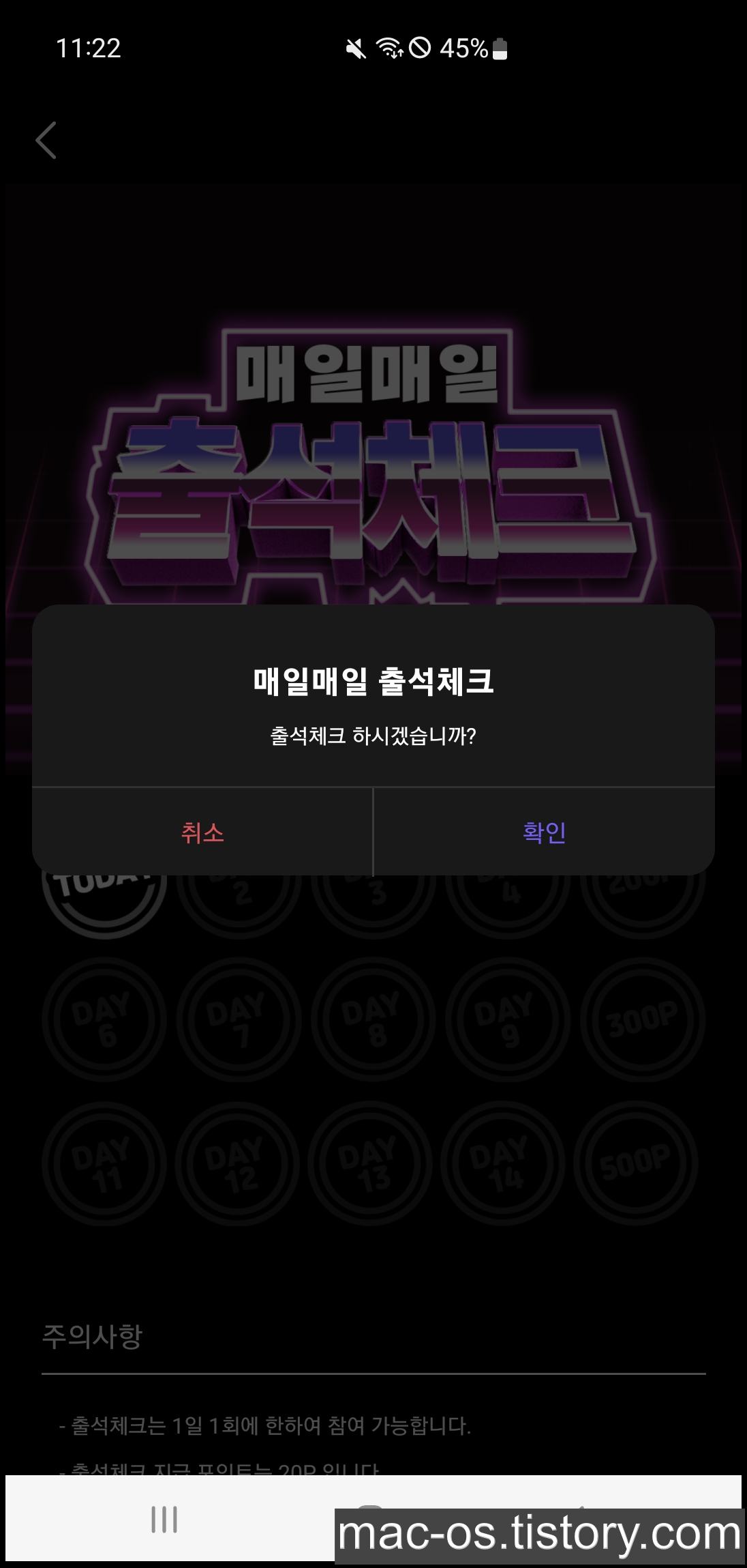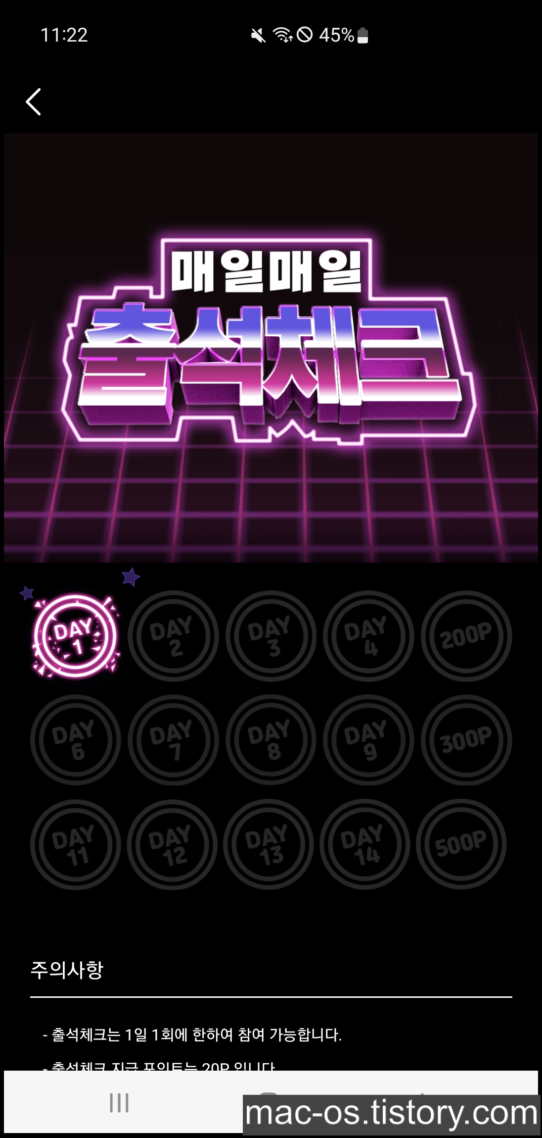 출석체크하면 흰색이었던 동그라미에 도장이 찍혀요. 출석체크 1일 1회당 20포인트를 얻을 수 있고 5일째에는 200P, 10일째에는 300P, 15일째에는 500P가 지급돼요.