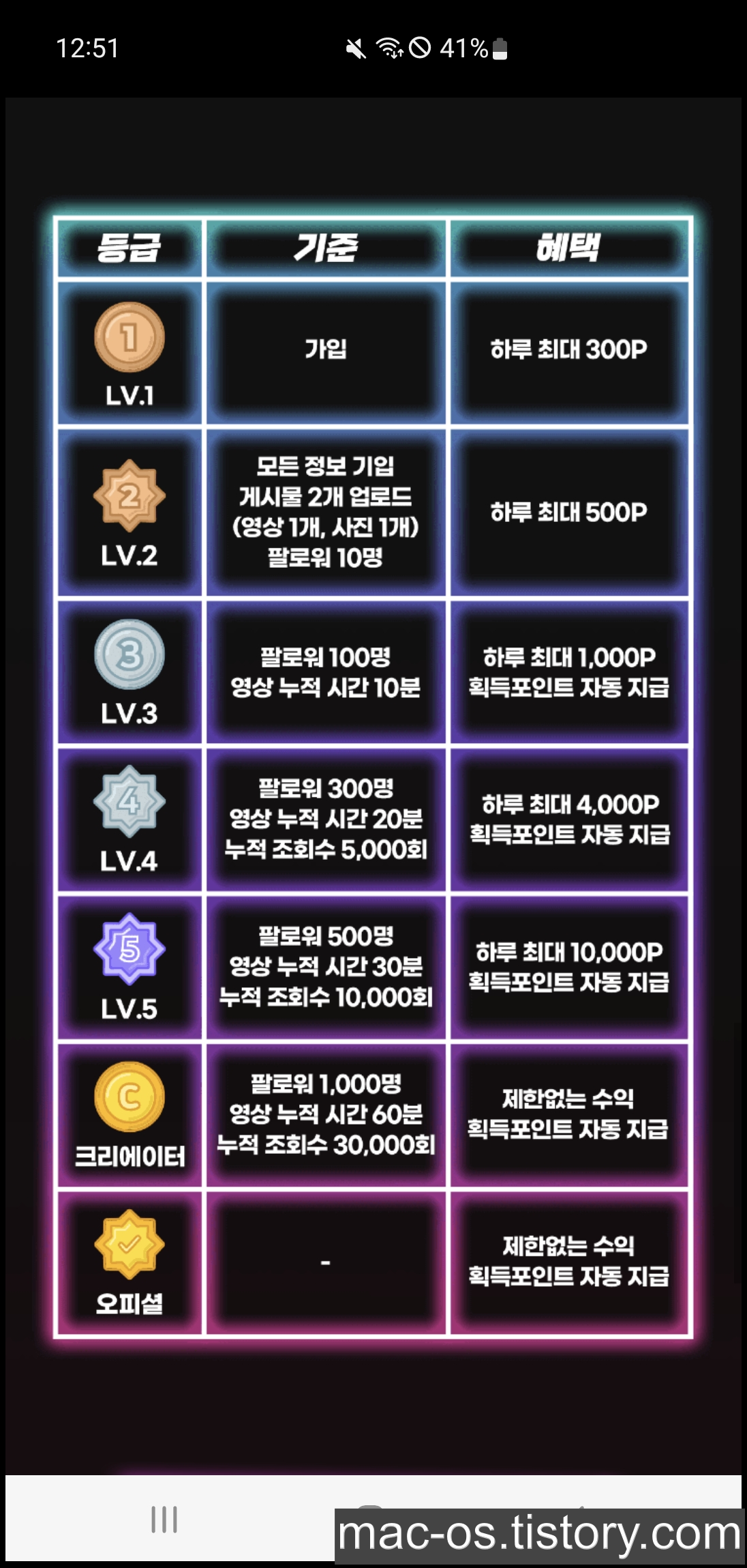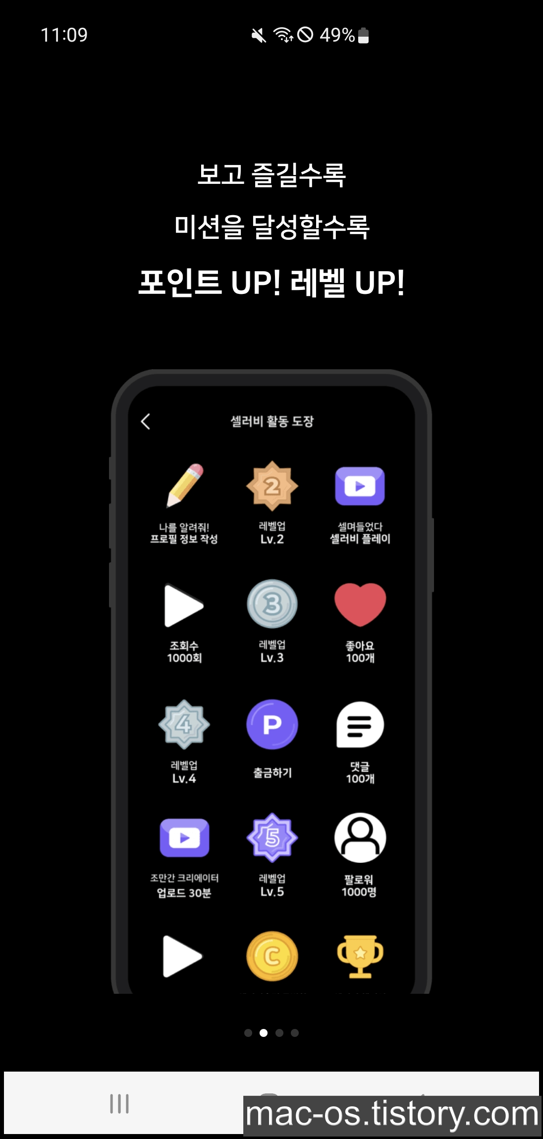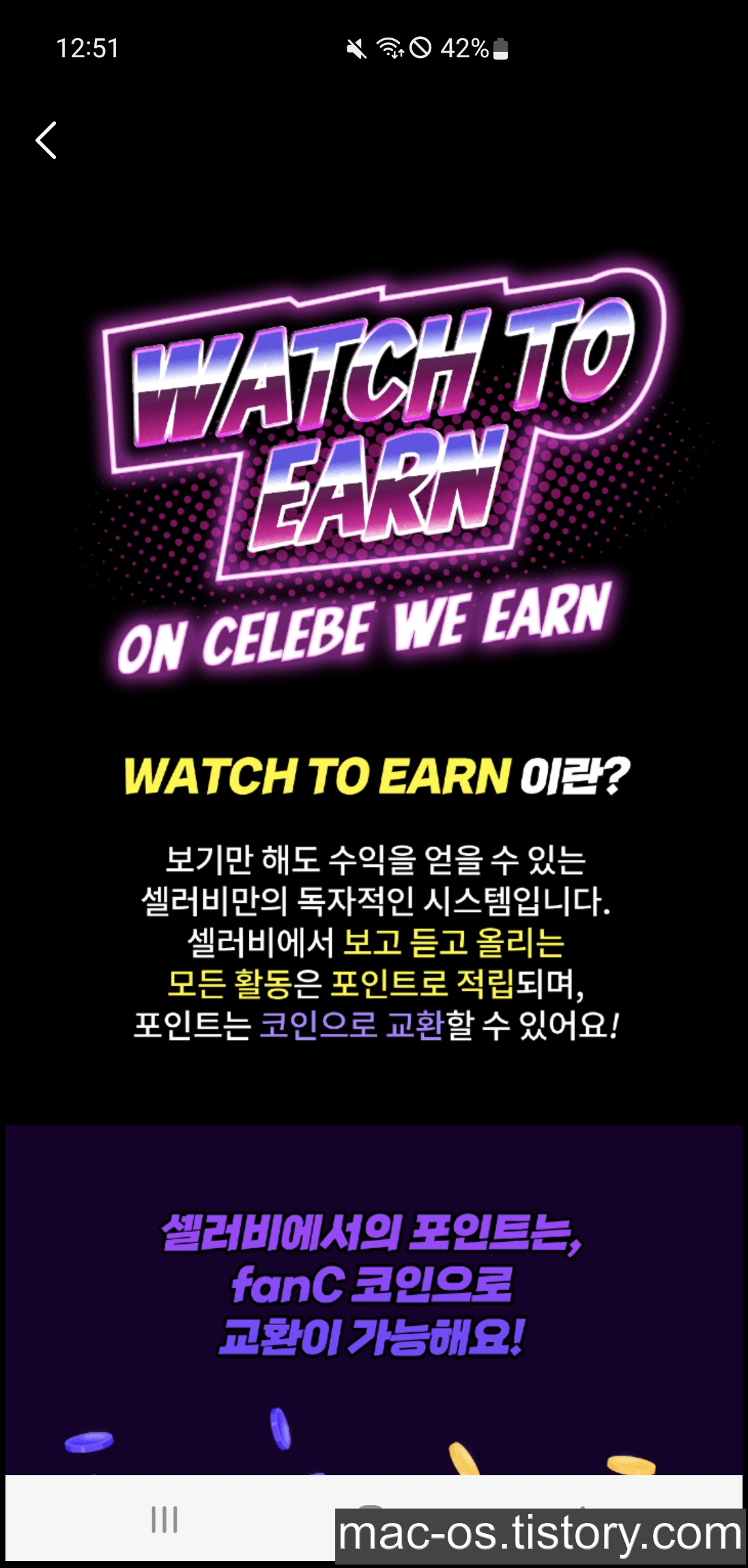 watch to earn이란 셀러비에서 영상을 시청만 해도 돈을 벌 수 있는 독자적인 시스템이라고 해요. 영상을 보는 것뿐만 아니라 듣고, 올리는 모든 활동은 포인트로 적립된다네요. 등급에 따라 하루에 얻을 수 있는 포인트양이 달라져요.