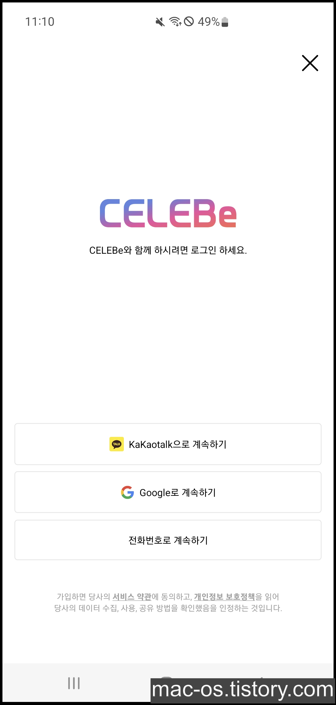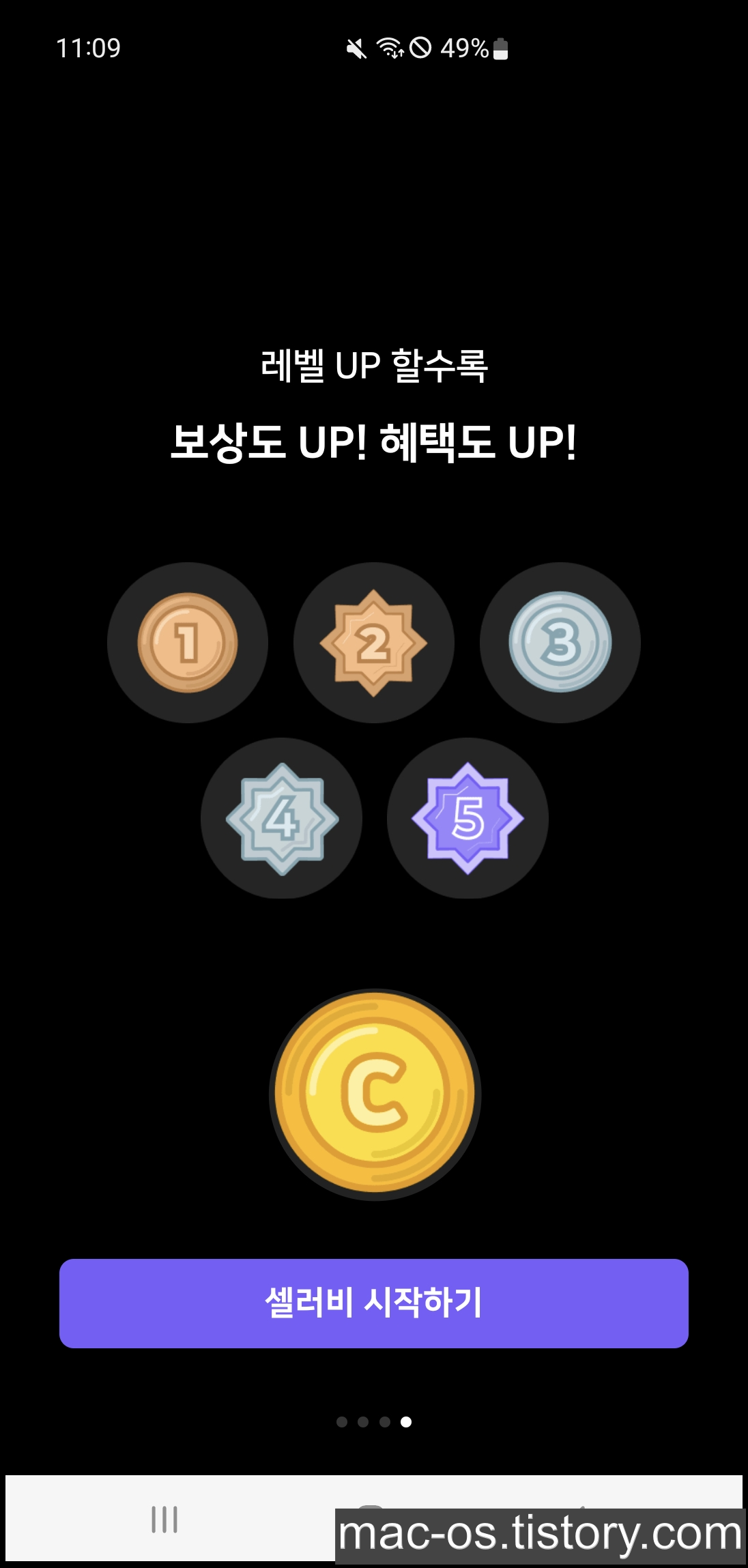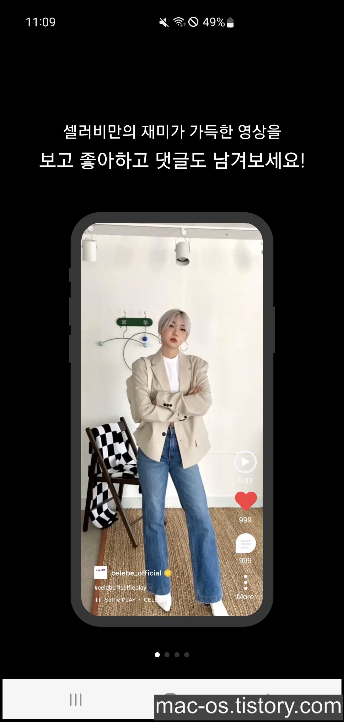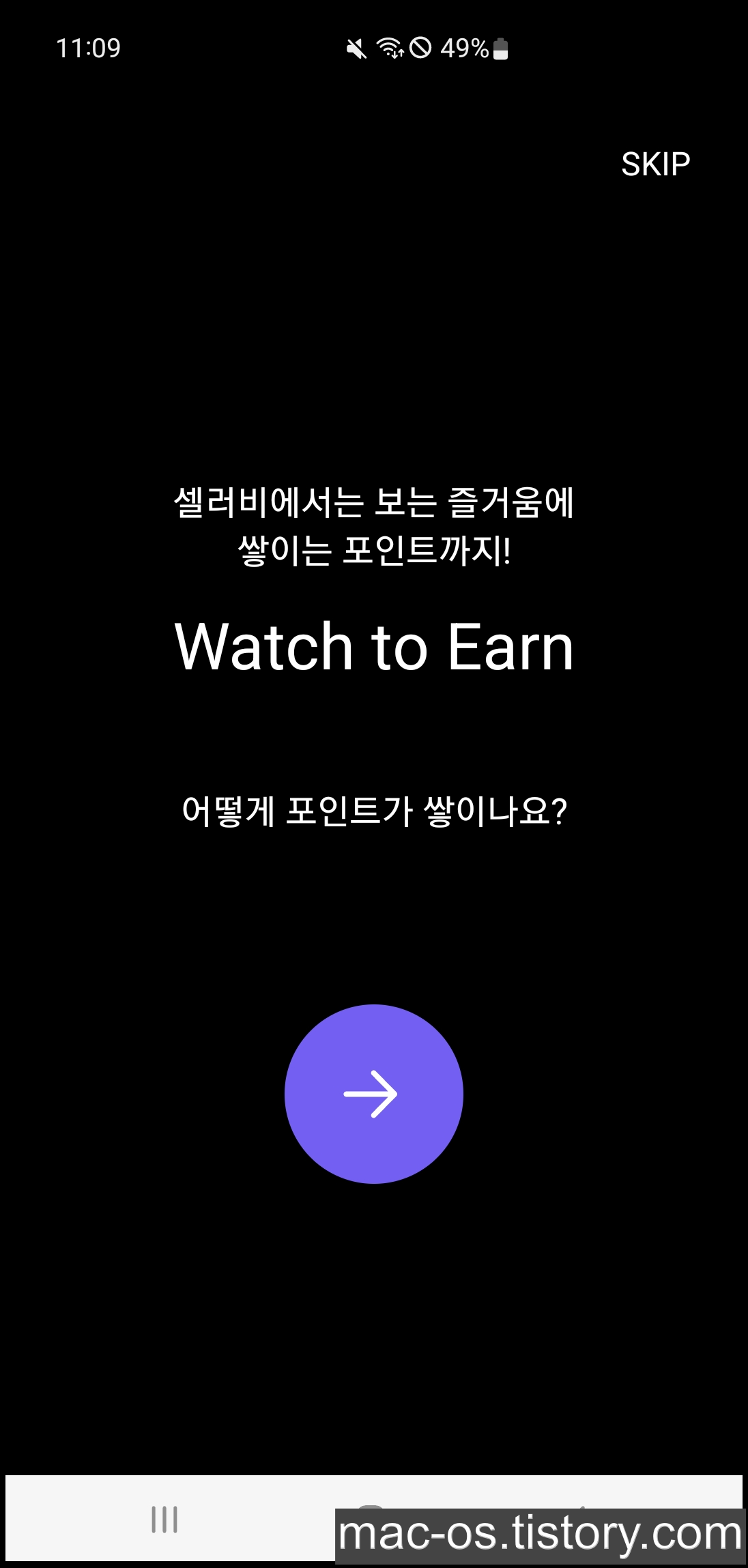 구글 플레이 스토어나 앱스토어에서 셀러비 앱을 설치할 수 있어요. 오른쪽 위에 있는 SKIP 버튼을 눌러도 되고 → 화살표 버튼을 눌러서 구경하셔도 돼요.
