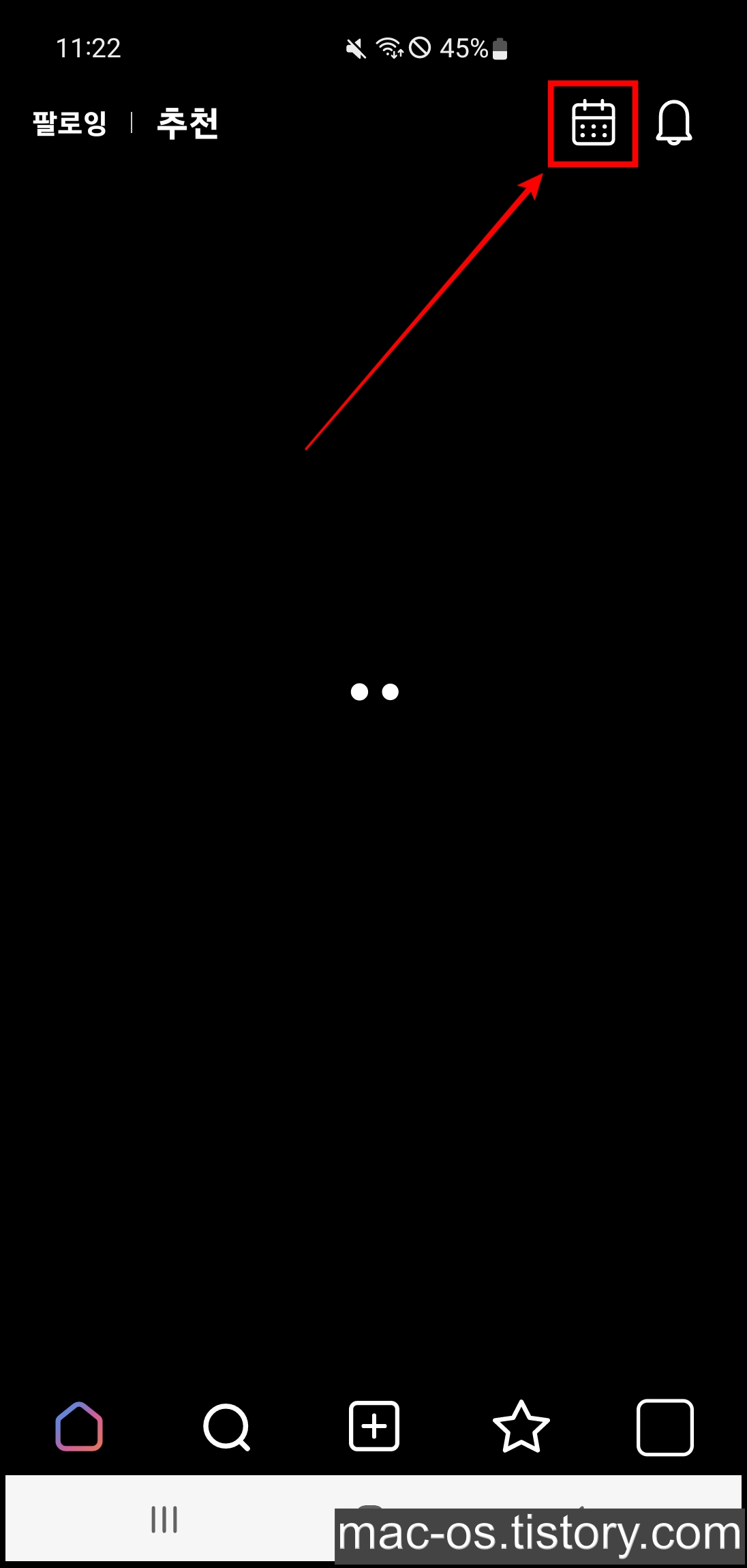 오른쪽 위에 있는 달력 버튼을 누르면 출석체크 페이지로 이동할 수 있어요. 동그란 TODAY 버튼을 누르면 출석이 가능해요.
