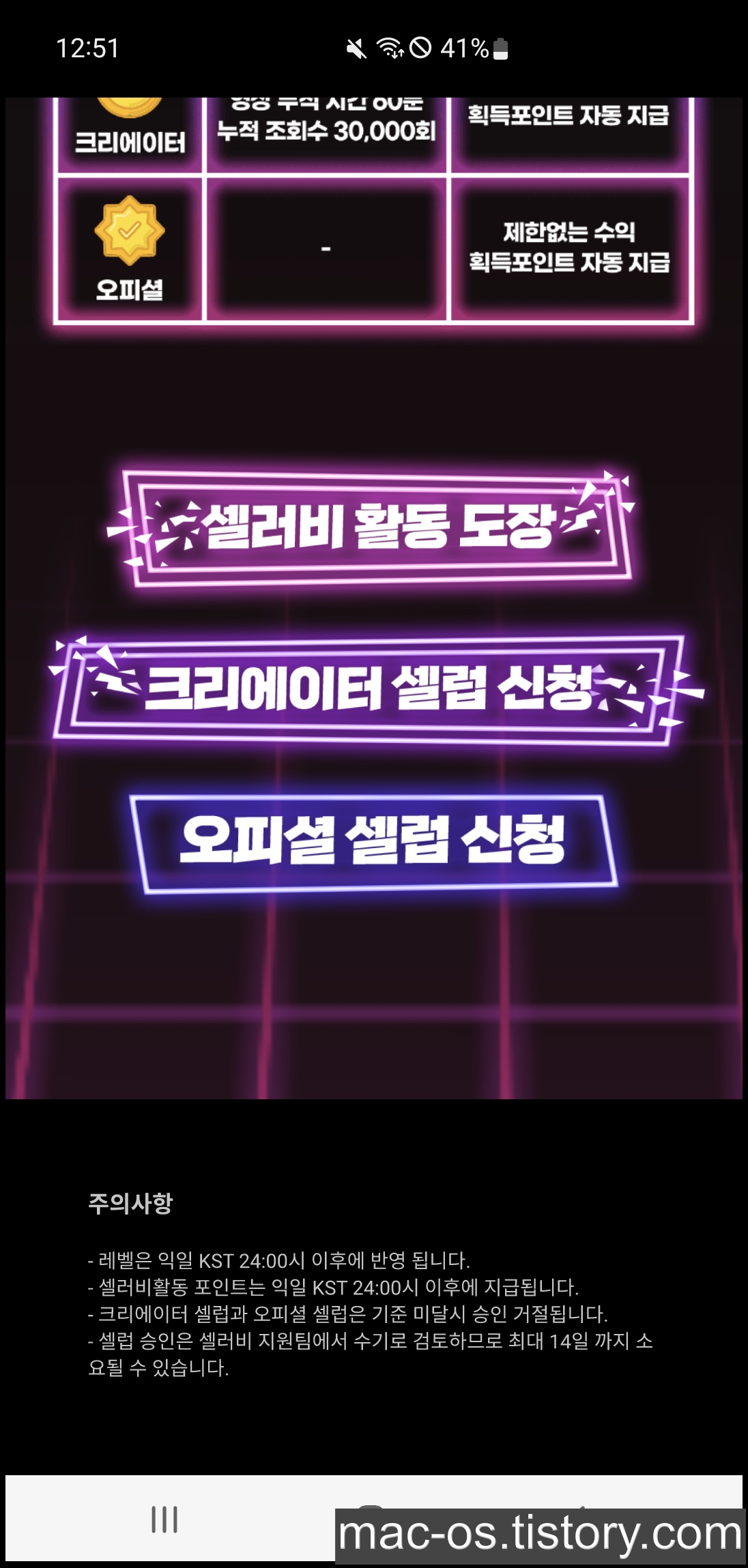 스크롤을 쭉 내려서 제일 밑으로 이동하면 [셀러비 활동 도장]과 [크리에이터 셀럽 신청], [오피셜 셀럽 신청]이 있는데요.