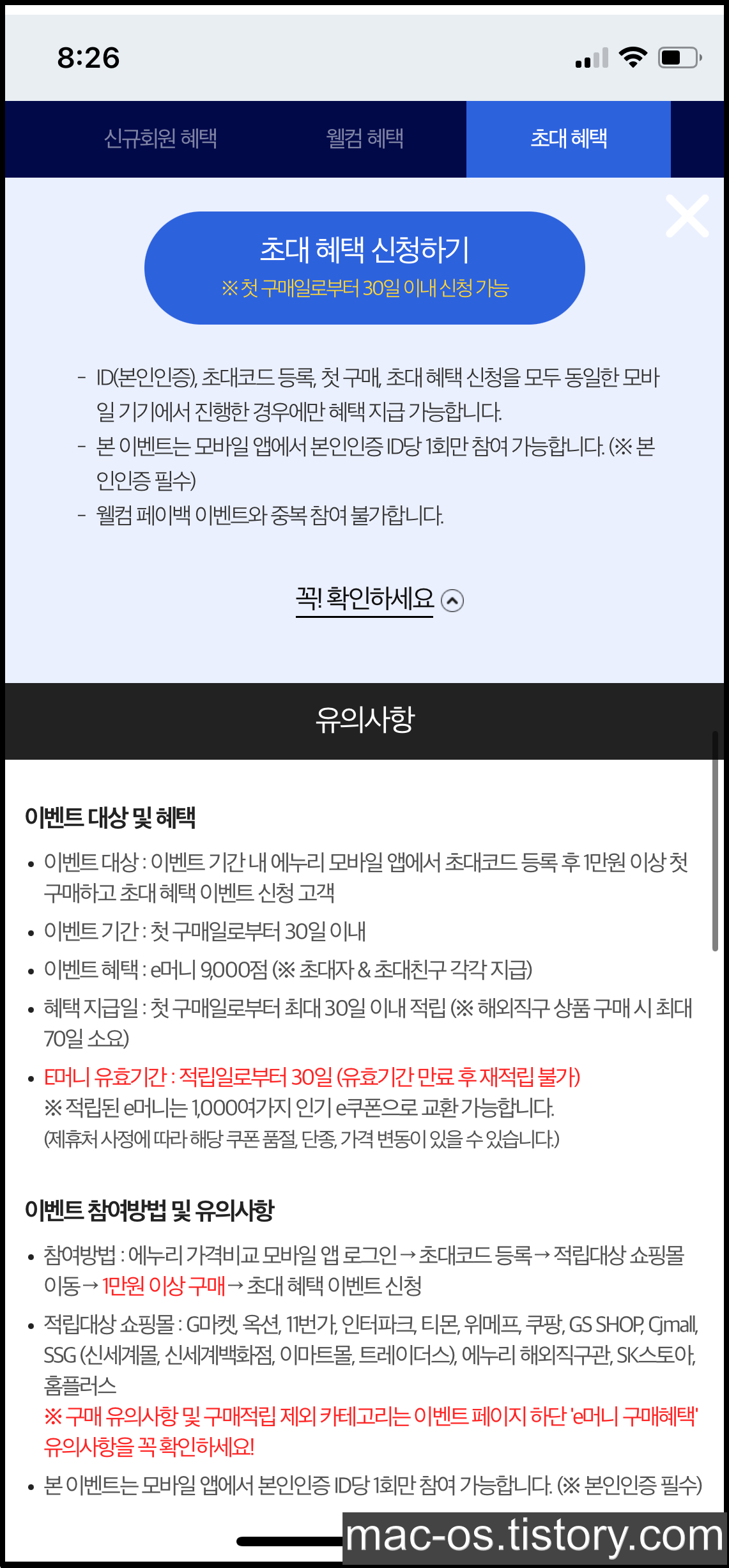 에누리 모바일 앱에서 초대코드를 등록하고 1만원 이상 첫 구매한 다음 [초대 혜택 신청하기] 버튼을 누르면 e머니 9,000점을 받을 수 있습니다.