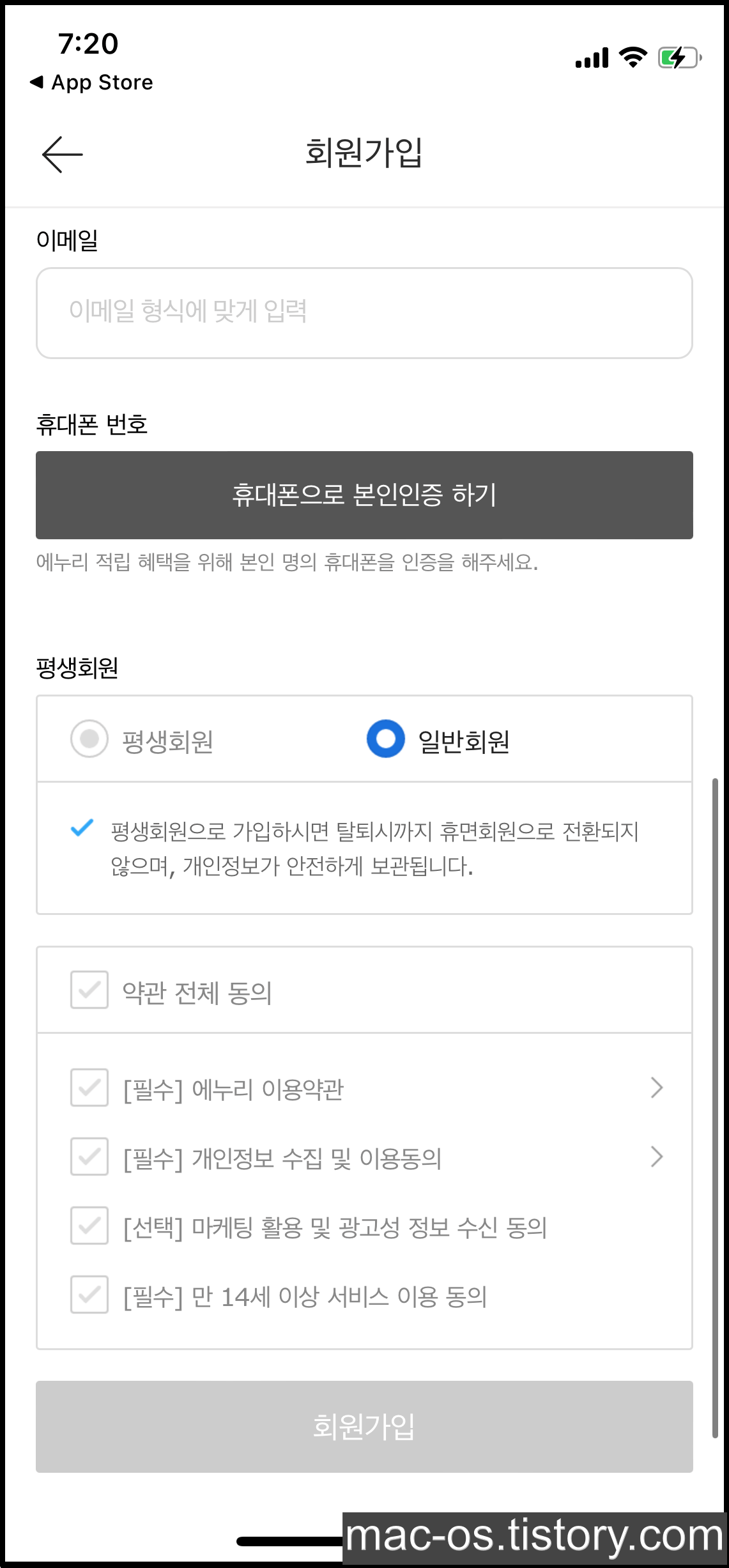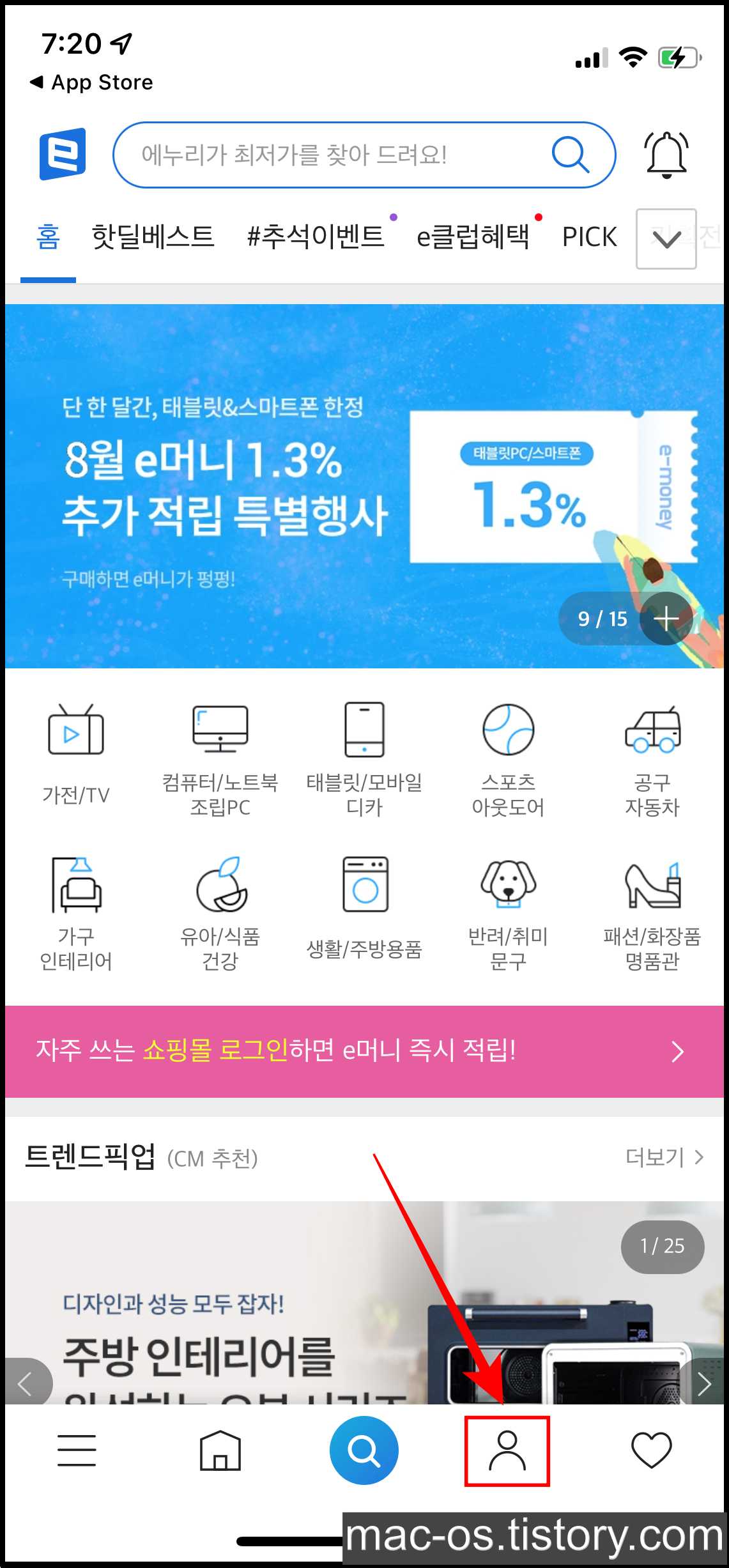 구글 플레이 스토어나 애플 앱스토어에서 에누리닷컴 앱을 설치할 수 있습니다. 앱을 설치하고 하단의 프로필 메뉴를 터치해주세요.