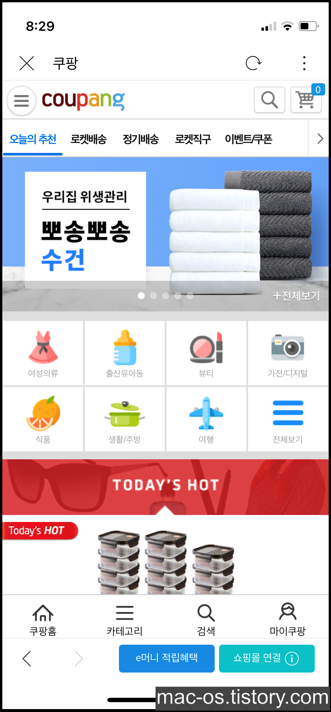 에누리닷컴 앱에서 쿠팡으로 이동한 화면입니다. 여기서 구매하고 싶은 상품을 검색하여 결제하면 최대 1.5%까지 e머니를 적립받을 수 있습니다.