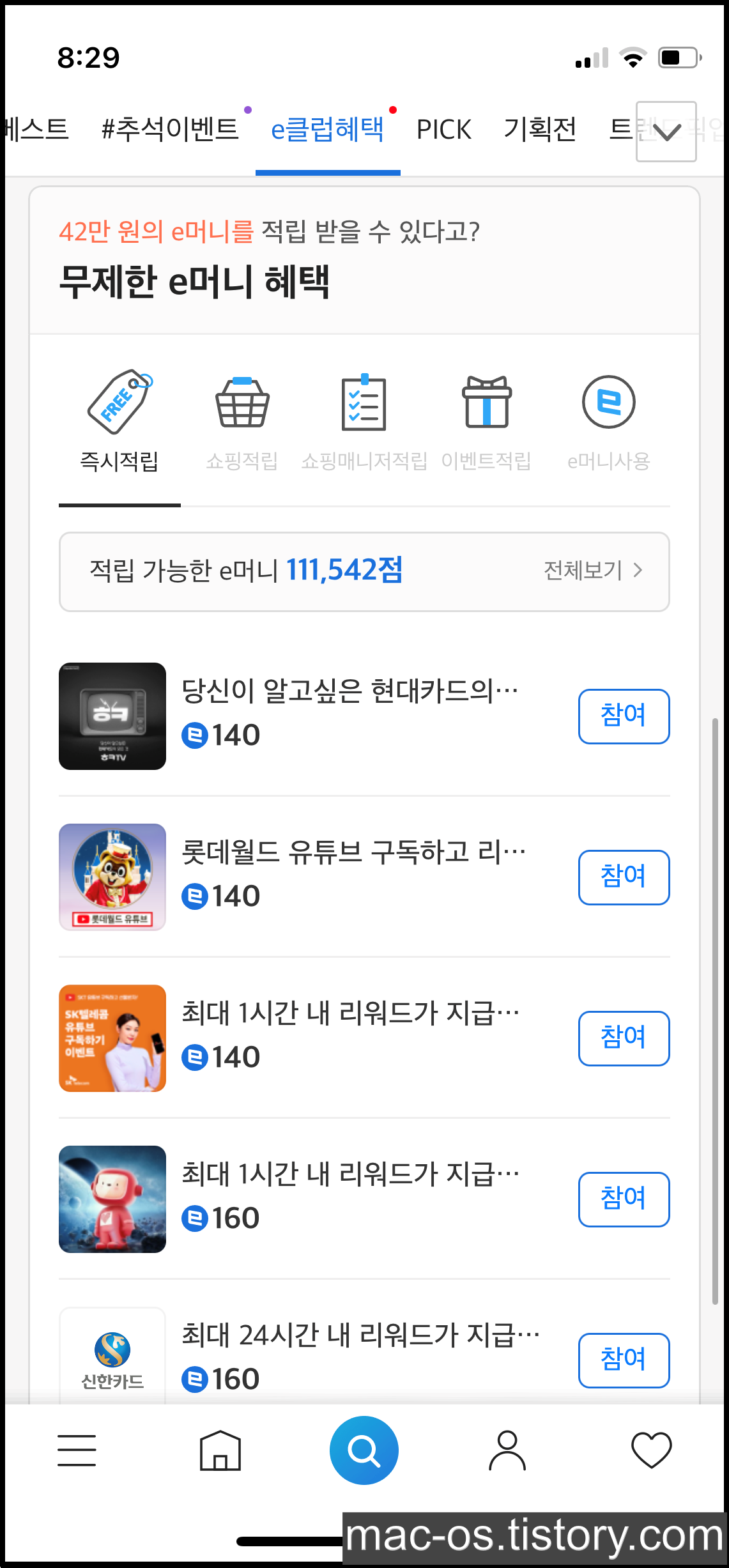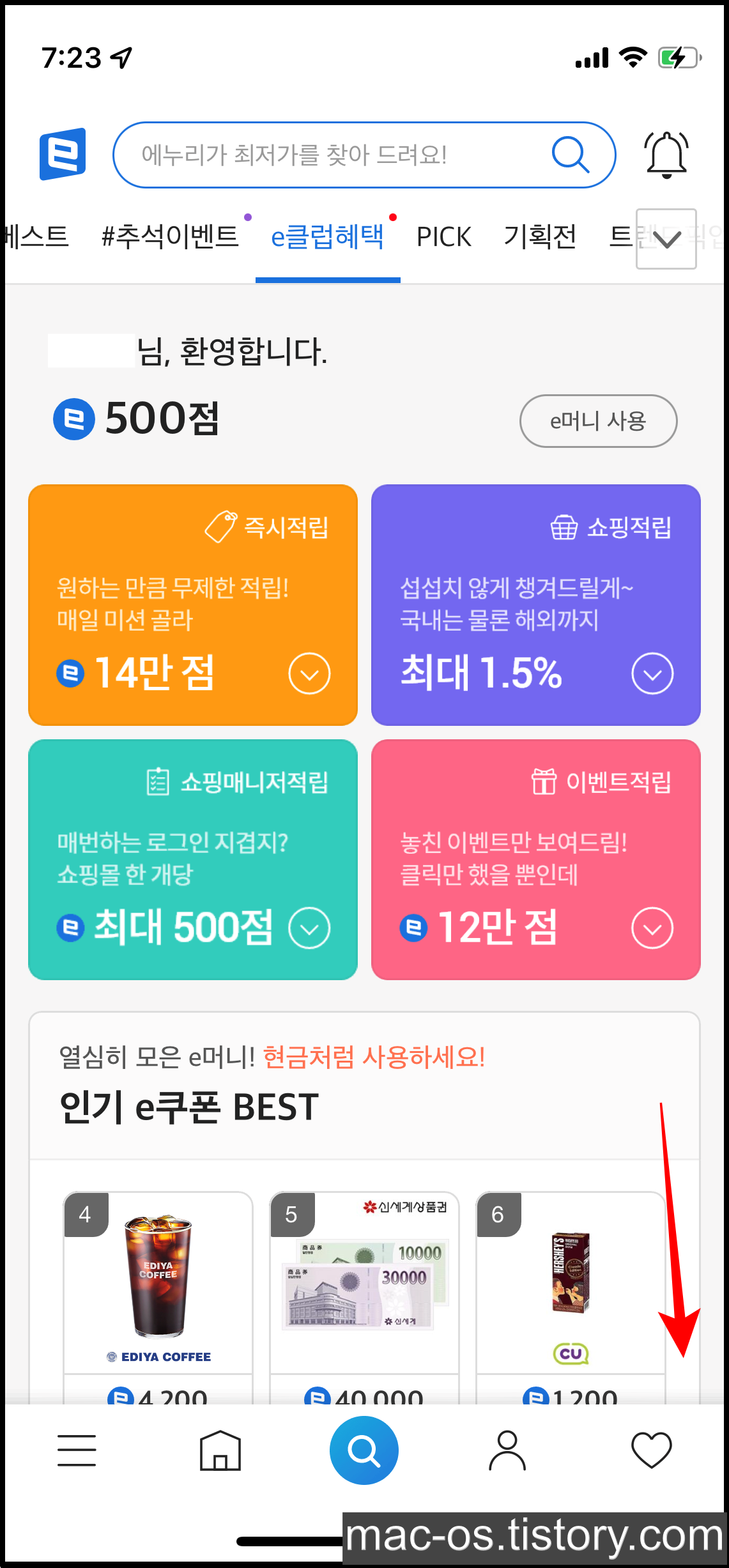 로그인 페이지에서 방금 가입한 아이디로 로그인해줍니다. 그리고 홈화면에서 상단 메뉴 [e클럽혜택]을 터치하고 아래로 화면을 내려줍니다.