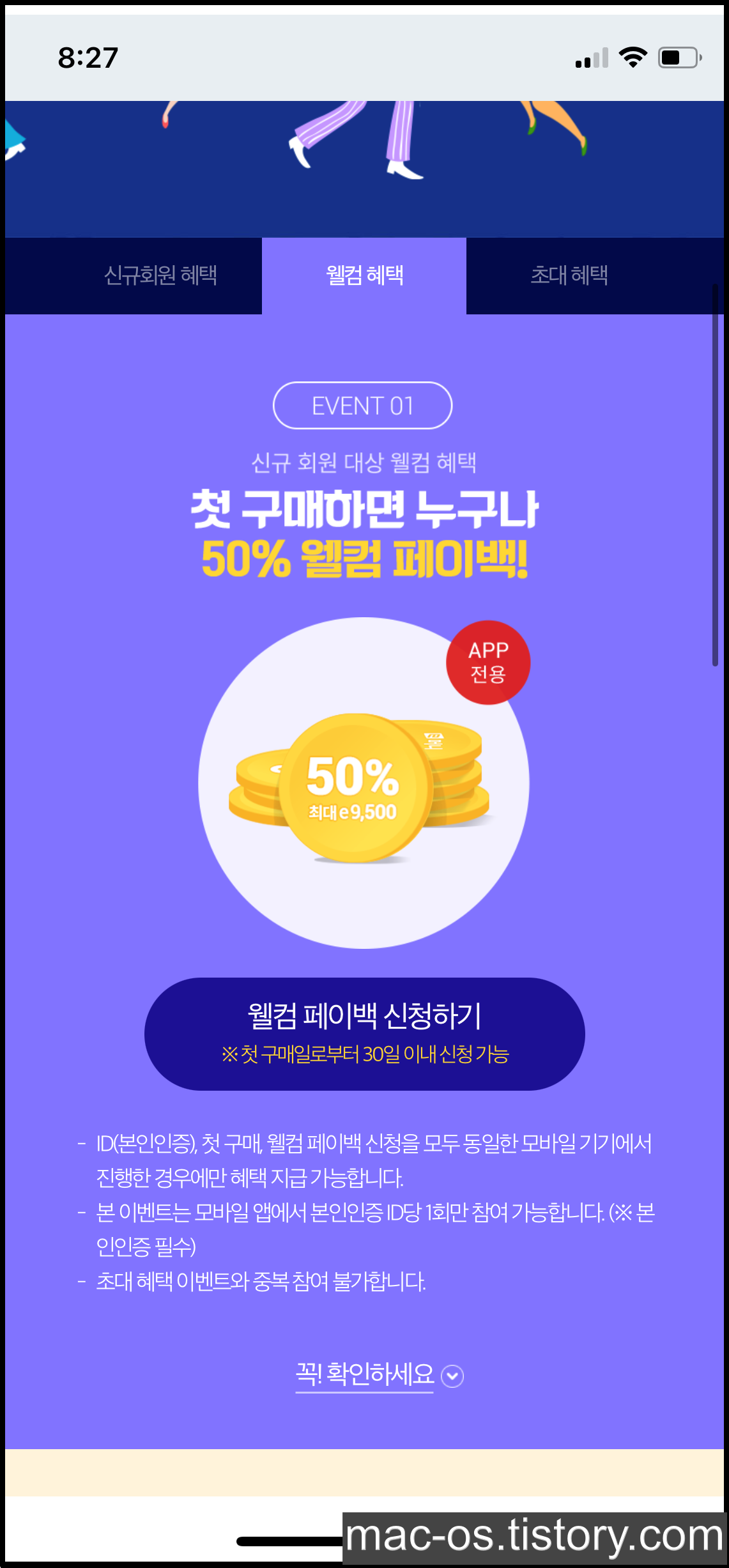 그외에도 첫 구매시 참여할 수 있는 이벤트도 있는데요. ID 본인인증과 첫 구매, 웰컴 페이백 신청을 모두 동일한 모바일 기기에서 진행한 경우 최대 e머니 9,500점을 50% 페이백으로 받으실 수 있습니다.