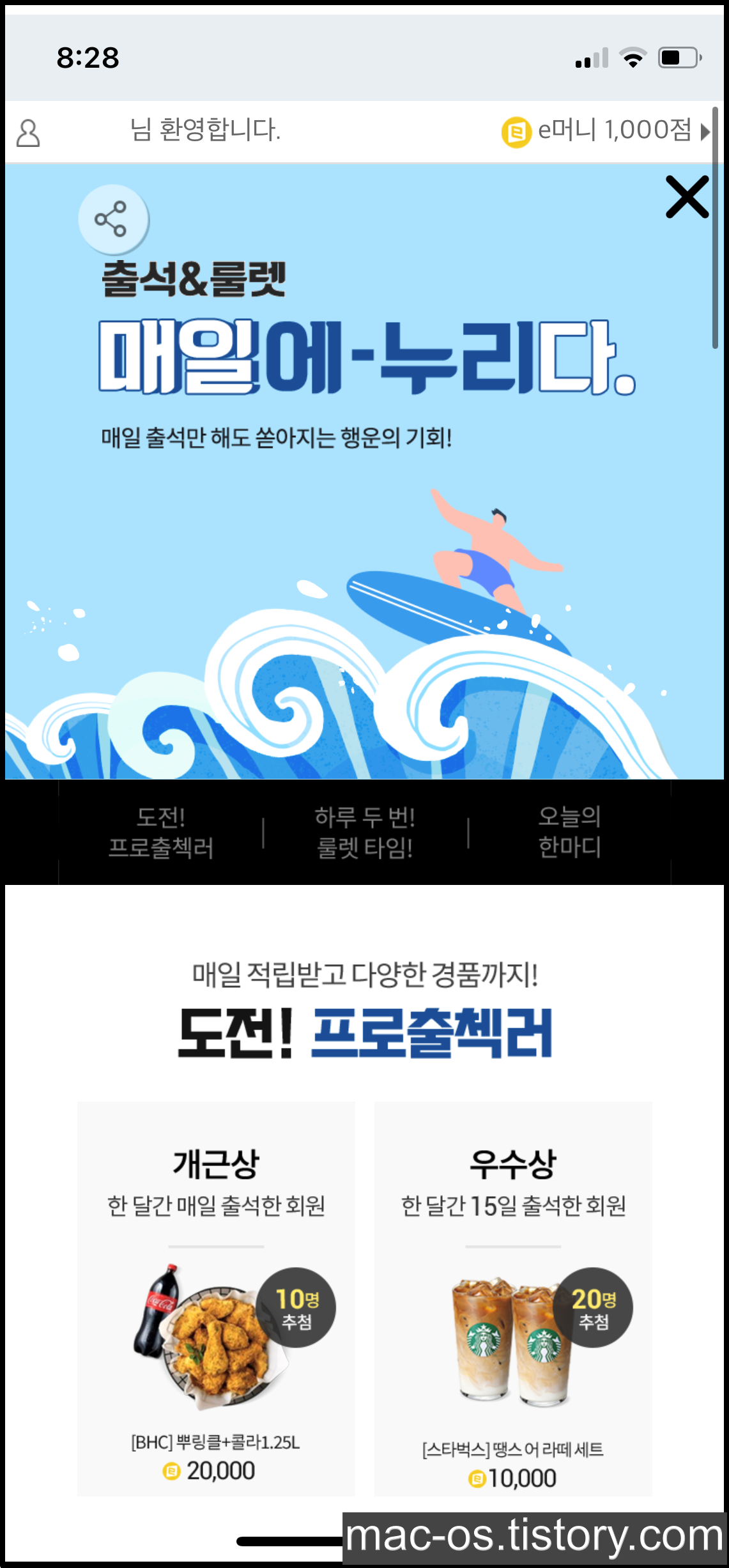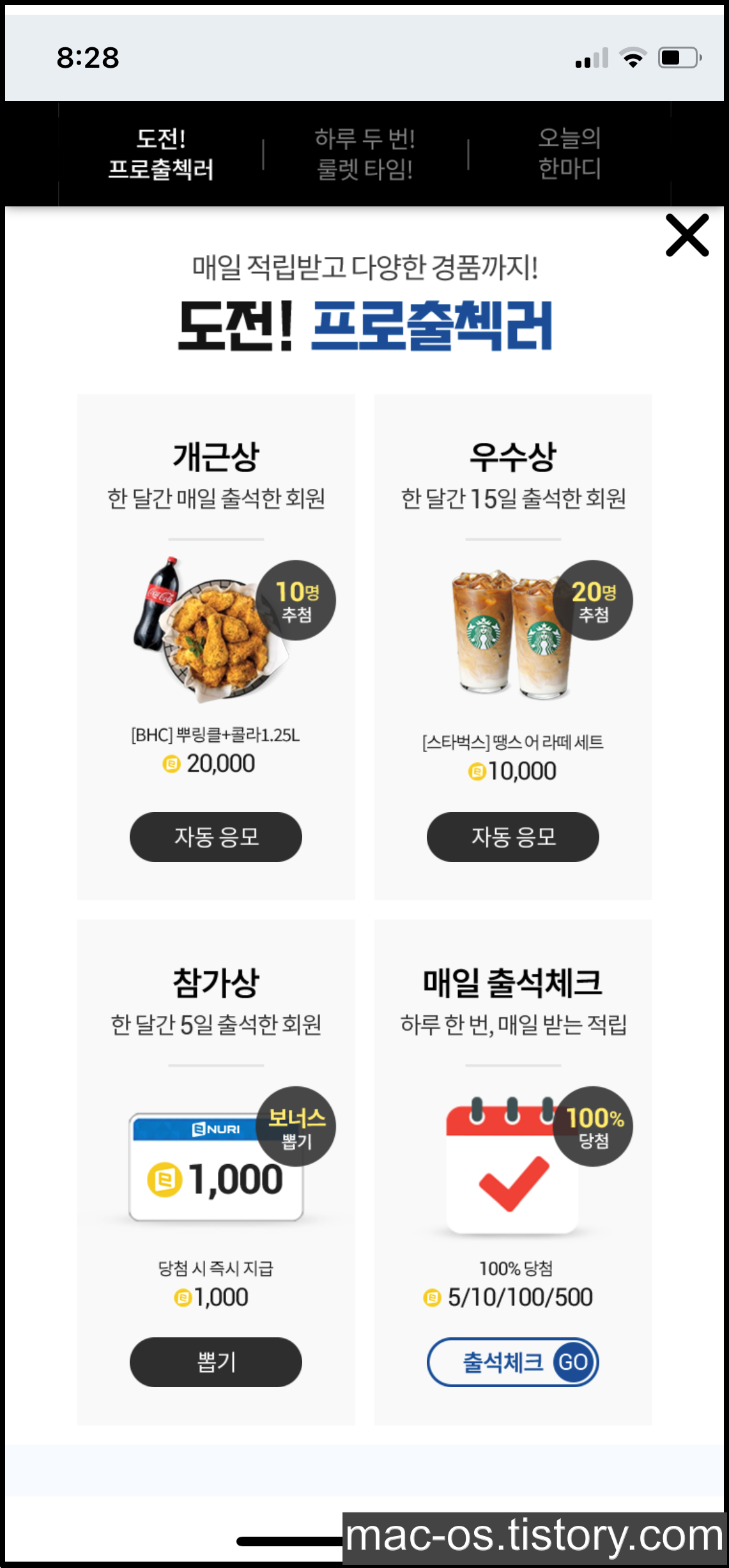 에누리닷컴 앱에서는 출석체크도 진행하고 있습니다. 출석체크 일수에 따라 개근상, 우수상, 참가상으로 구분되며 이는 자동으로 응모됩니다.