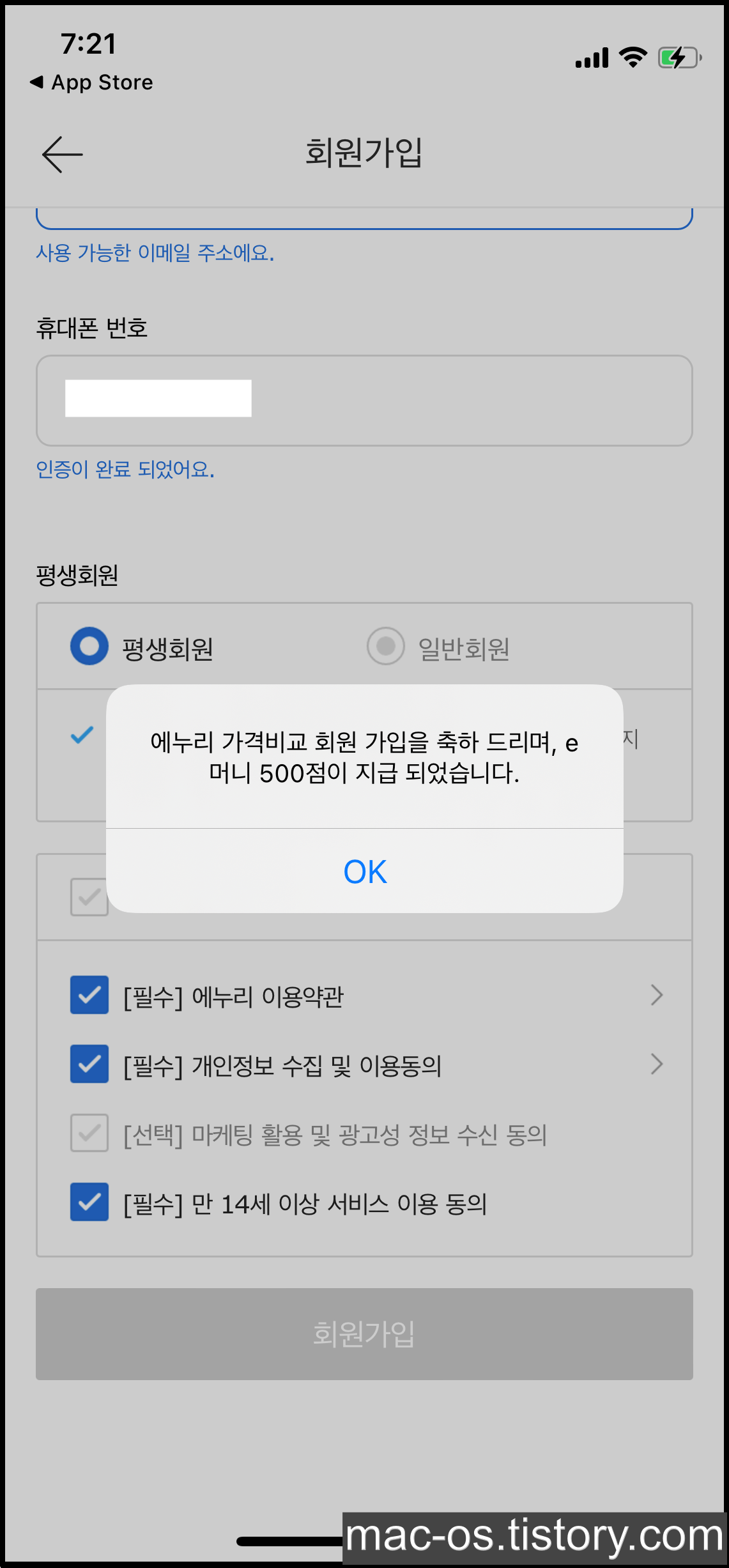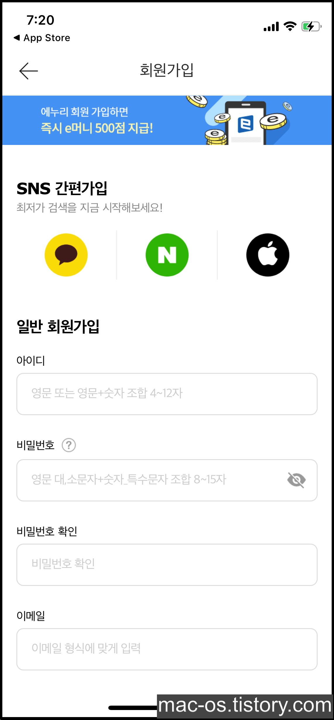 간편회원가입에서 아이디와 비밀번호를 입력하고 가입을 완료해줍니다. 회원가입을 완료하면 e머니 500점이 지급됩니다.